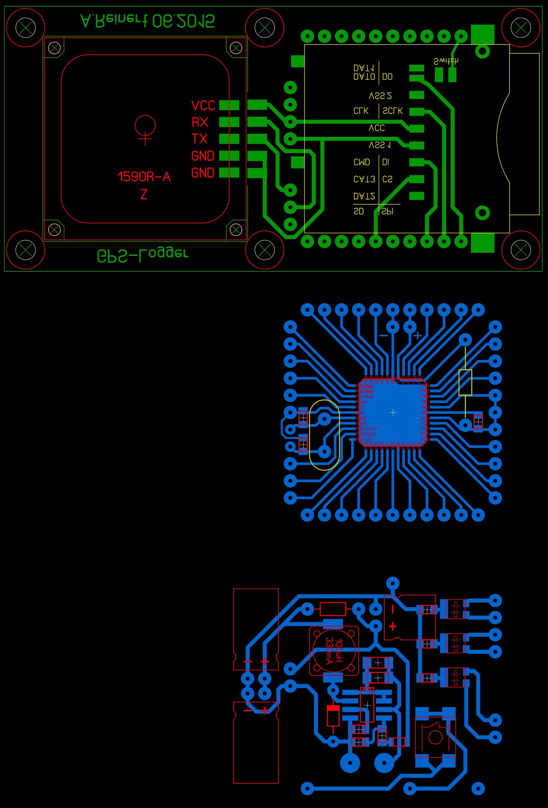 > Sehr schönes Gerät, hast du vor den Schaltplan und die Hex zu > veröffentlichen ? Nun, ich erstelle üblicherweise keine Schaltpläne. Wenn ich mir Programme wie Eagle ansehe dann macht man mit diesen ja nichts anderes als Bauteile zu "platzieren" und diese miteinander zu verdrahten. Ich mache das üblicherweise direkt im Layoutprogramm. Anbei mal ein Screenshot aus Sprintlayout. Möglicherweise hat ja jemand interesse das in Eagle zu erfassen. Die 3 Platinen ergeben eine Sandwichbauweise. Ausserdem noch die Hex Datei. Letztendlich ist Hardwaremäßig an dem Ding aber auch wirklich nichts spektakuläres dran. Ein Stepdownwandler mit einem MC34063, Ein Taster, 6 Leuchtdioden. Der Atmega hat 3 Verbindungsleitungen zur Sd-Karte und eine "Ader" zum GPS-Empfänger (ok, txd habe ich auch an das GPS-Modul angebunden, aber Softwaremäßig wird das nicht genutzt.) Die meiste Arbeit steckt halt in der Software...