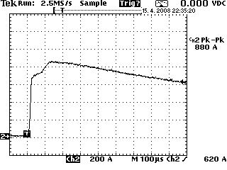 Buckshot schrieb: > MiWi schrieb: >> Du kennst Blitzröhren? >> >> Da passiert sowas. > > Das das schnell geht ist klar. Nur, wie schnell? Vermutlich ja auch > abhängig vom Grad der Überspannung. > Ob es bei 100facher Überspannung überhaupt noch eine Verzögerung gibt? 450V/ etliche uF an einer ca. 15cm langen Blitzröhre mit anderen Worten: der gesammte Kreis Elko<>Verkabelung<>Blitzröhre hat 100us nach dem Zünden alle Ls mehr oder weniger gesättigt und dann einen Innenwiderstand von 0,5Ohm.... nach 5ms ist der Strom wieder auf ~ 100A herunten. Zündung durch einen 6kV-Puls am Zünddraht. Am Oszibild ist der Strom durch die Röhre sichtbar (mit einer Stromzange gemessen) Schnellere Messungen sind nicht mehr verfügbar. Es geht also schnell... Grüße MiWi