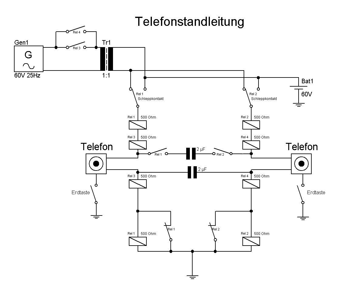 Hier ist eine etwas Bessere Lösung. Früher hatten die Telefone eine sogenannte Erdtaste, damit wird hier geklingelt. Es werden vier bifilar gewickelte Relais benötigt. Bei Rel 3 und Rel 4 werden die Wicklungen so gepolt, daß sich die Magnetfelder aufheben wenn durch beide Wicklungen ein Strom fließt. Diese Relais ziehen dann nur an wenn eine Erdtaste betätigt wird und leiten damit das klingeln ein. Die oberen zwei Kontakte Rel 1 und Rel 2 müssen Schleppkontakte sein, sonst würden die Relais anfangen zu summen und nicht richtig schalten.