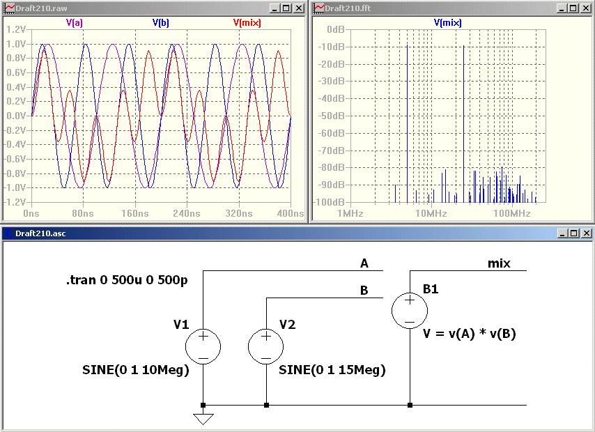 Hallo Sven Die beiden Signale werden beim idealen Mischer einfach multipliziert. Es entsteht die Summe und der Differenz der beiden Frequenzen. Das ungewünschte Produkt muss dann weggefiltert werden. Gruß, Bernd