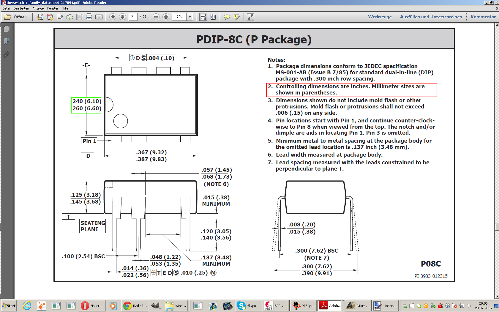 Hi, falls das hier zu einem Ergebnis führt, könnte man es hier bitte ergänzen: https://www.mikrocontroller.net/articles/Datenblätter Siehe Anhang: Es ist ja schon toll, dass drei Zeichnungen aus EINEM Datenblatt verschiedenartig bemaßt sind. Doch wenn ich nun dank der Hinweise weiß, was mm und was inch sind (hätte man sich anhand der Relation noch denken können ;), finde ich nirgends einen Hinweis darauf, wofür noch mal die horizontale Trennlinie ("Bruchstrich") mit zwei verschiedenen Maßen (gleicher Einheit) gut ist. Schnelle Idee? Grüße Oekel