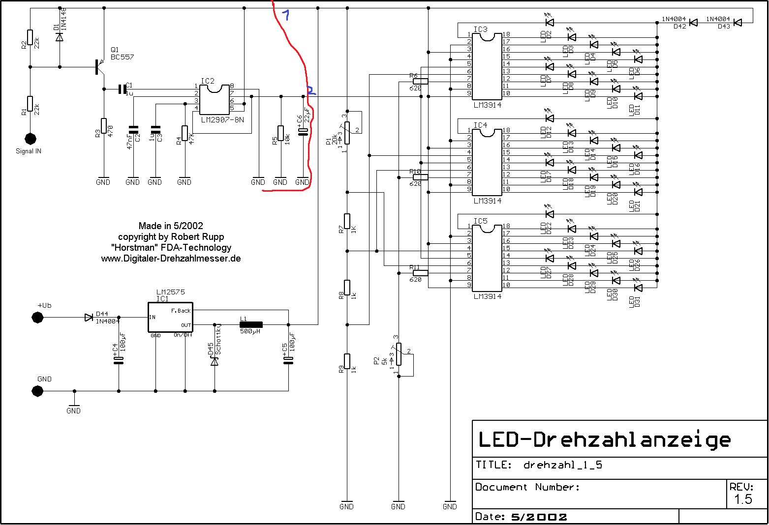 Die Schaltung von der Internetseite nimmt die Impulse auf der Primärseite von der Zündspule ab. Bei mir sollen die Impulse über das Zündkabel abgenommen werden, sodass ein Teil des Schaltplans (Anhang) wahrscheinlich weggelassen werden kann. Dafür würde dann die obere Schaltung davorgesetzt werden. Ist das richtig, dass das LM2907-8N weggelassen werden kann? (Rote Linie) Jetzt hätte man ja noch zwei offene Leitungen (1 und 2). Was macht man denn dann mit denen, und an welcher kommt der letzte Ausgang vom NAND Gatter?