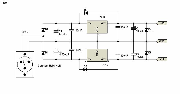 An jedem Verstärker 100 µF zum Abblocken ist gut gemeint, aber deutlich zuviel, da geht der Spannungsregler beim Einschalten in die Strombegrenzung. Weg damit! C1 und C2 sind schon mit 100 µF zu groß, 10 µ wären besser.