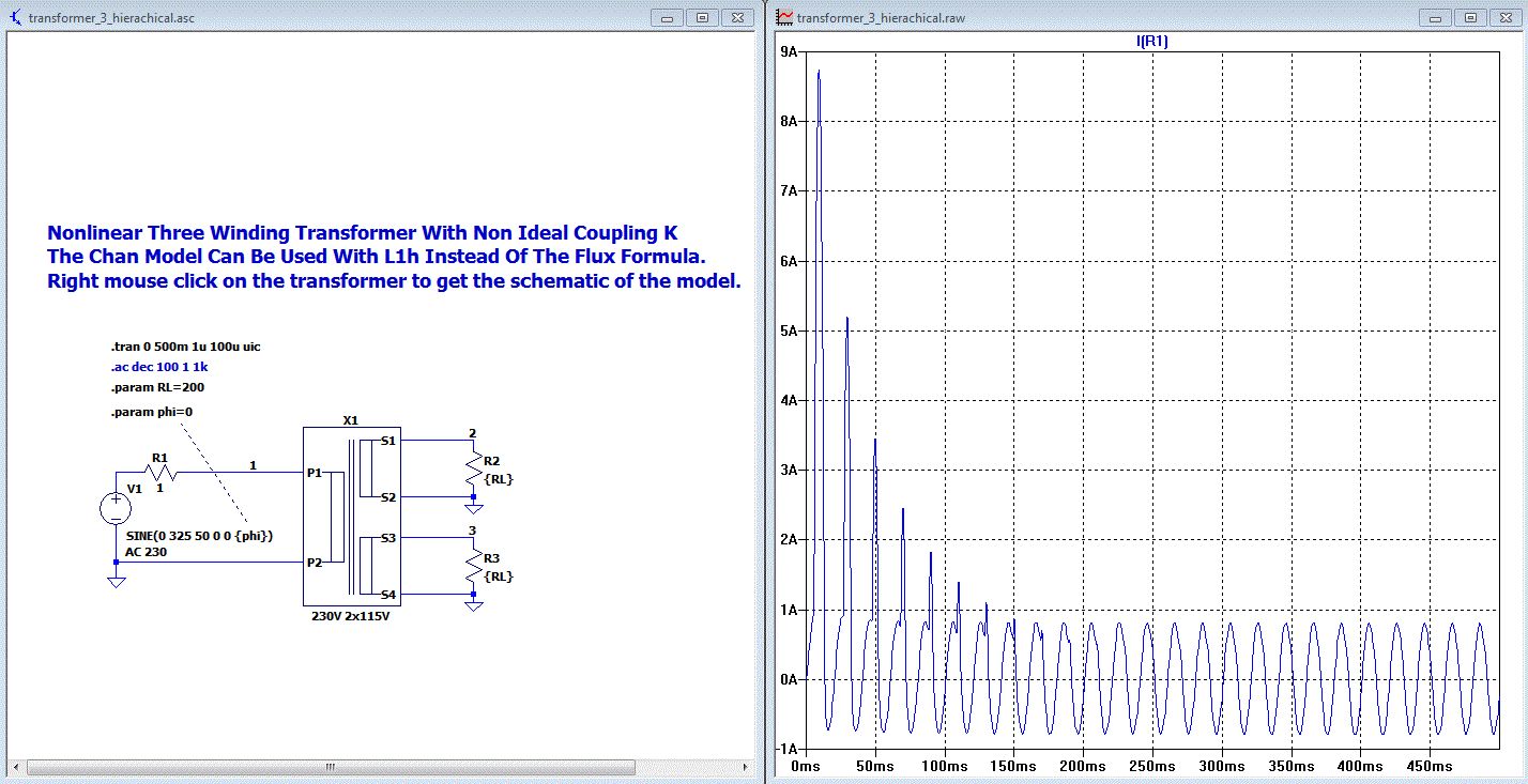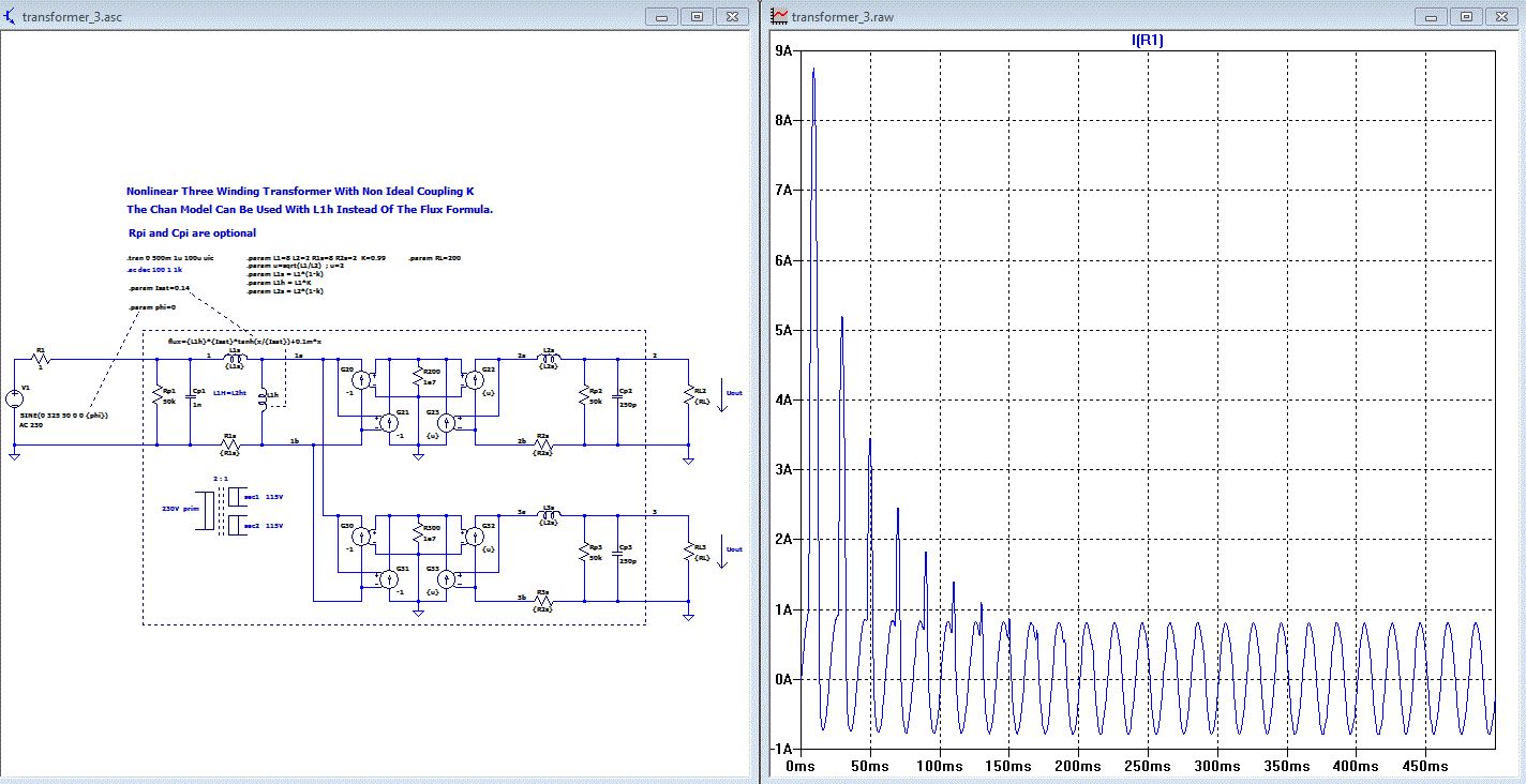 Wenn du die Lösung mit der Hauptinduktivät machst, dann hast du dort den Freiheitsgrad entweder das Hysteresmodell oder das einfachere Sättigungsmodell ohne Hysteres für die Hauptinduktiviät des Transformators zu nehmen.