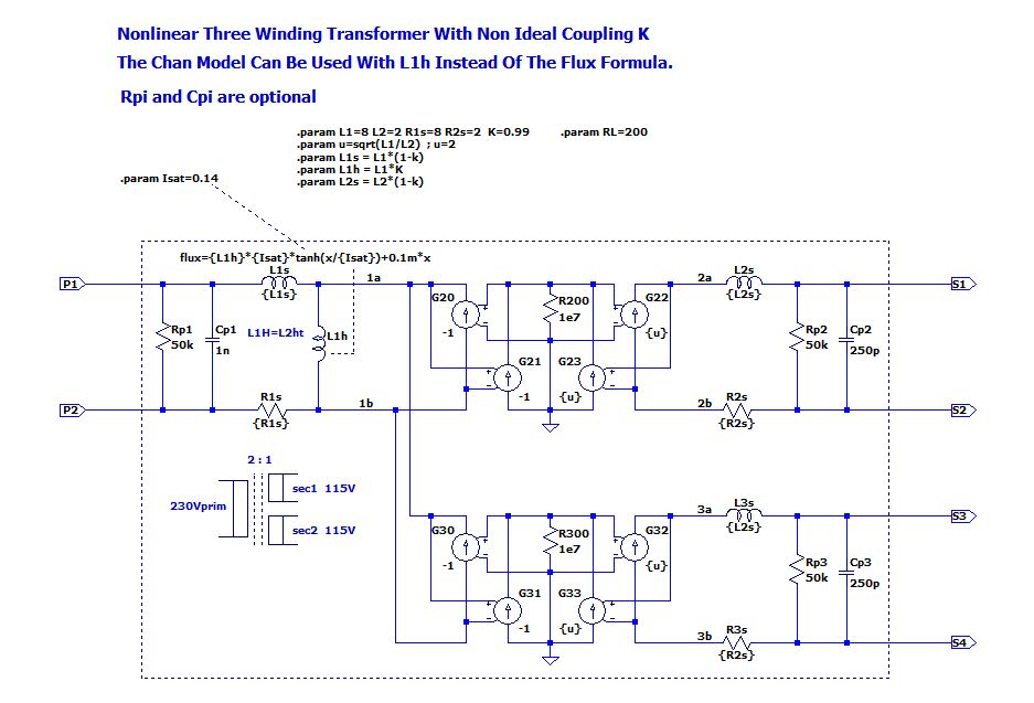 Meine Schaltung ist im Prinzip eien Netztrafo 230V mit 2 Sekundärwicklungen von jeweils 115V. Der besteht aus der Hauptinduktivät(Magnetisierung) L1h und dessen Streuinduktiviät L1s. Sekundär gibt es dann noch die Streuinduktivitäten L2s und L3s. Die Kopplung geschieht mit den gesteuerten Quellen die ideale Transformatoren mit der Übersetzung ü darstellen. Rpi und Cpi sind Parsitics. Die kann man auch erst einmal weglassen.