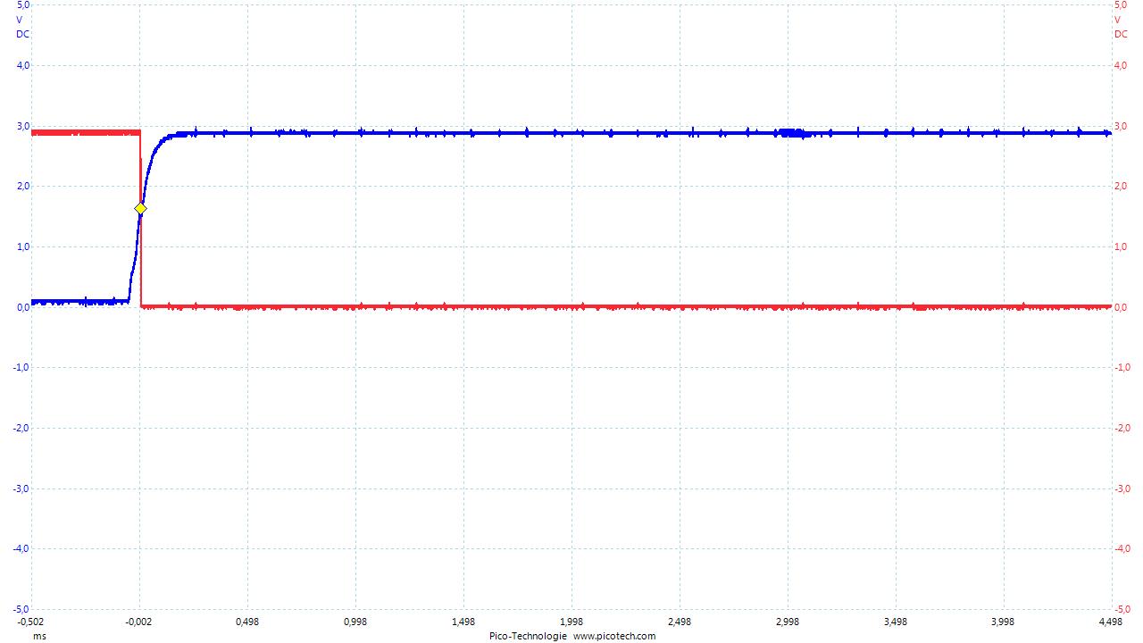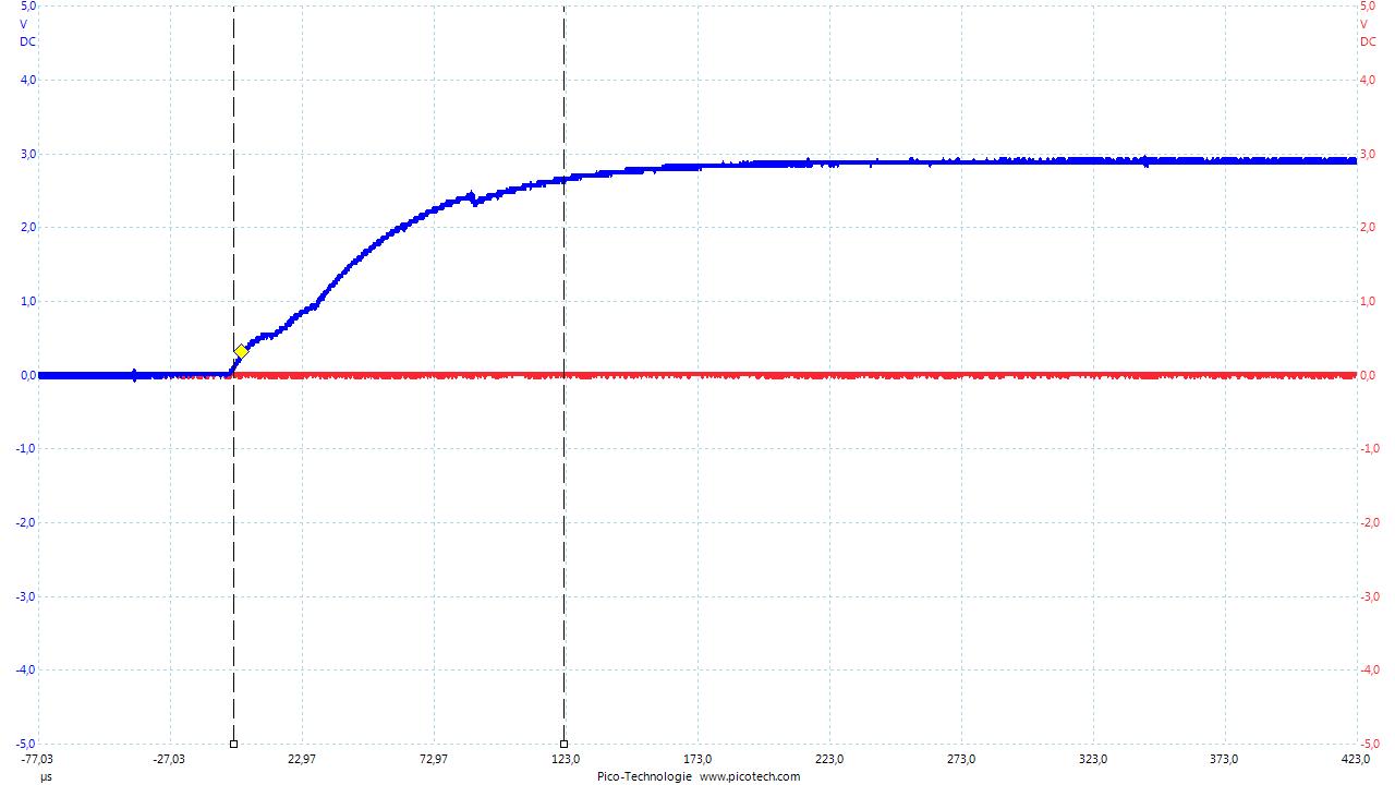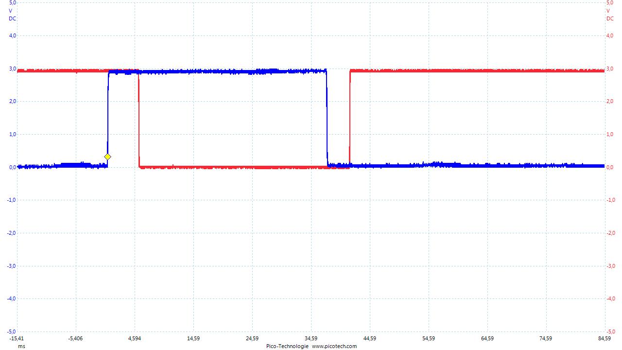 Hallo wieder :) STM32F4 Discovery, EMBlocks IDE. Auf den Bildern oben sieht man die blaue Kurve, die aus einem Komparator kommt. Die rote Kurve zeigt den Ausgangspin PA15. Ich glaube es ist einfacher, den Code kurz durchzugehen, als die Funktion zu beschreiben, vielleicht liegt ja auch hier der Hund begraben (falls ich mich Irre, mache ich gerne eine Funktionsbeschreibung) ;) Mir stellt sich die Frage, warum es so "lange" dauert, bis der Interrupt gesetzt ist und PA15 durchgeschaltet wird. Es sieht auch so aus, als ob der Interrupt willkürlich (was natürlich nicht der Fall sein wird) irgendwo auf meinem High Signal gesetzt wird, mal direkt nach der Flanke, mal mittendrin, mal am Ende. Ich habe auch versucht, die Flanke steiler zu bekommen, allerdings kriege ich das leider nicht gebacken, da ich erst vor relativ kurzer Zeit in die Elektronik eingestiegen bin. Habe schon ein wenig gegooglet und bin über Schmitt-Trigger, FlipFlops und Komparatorhystere gestolpert. Welche Richtung sollte ich hier einschlagen, falls es notwendig ist die Anstiegszeit zu verkürzen? Vielen Dank schon mal für eure Mühe! Reggie