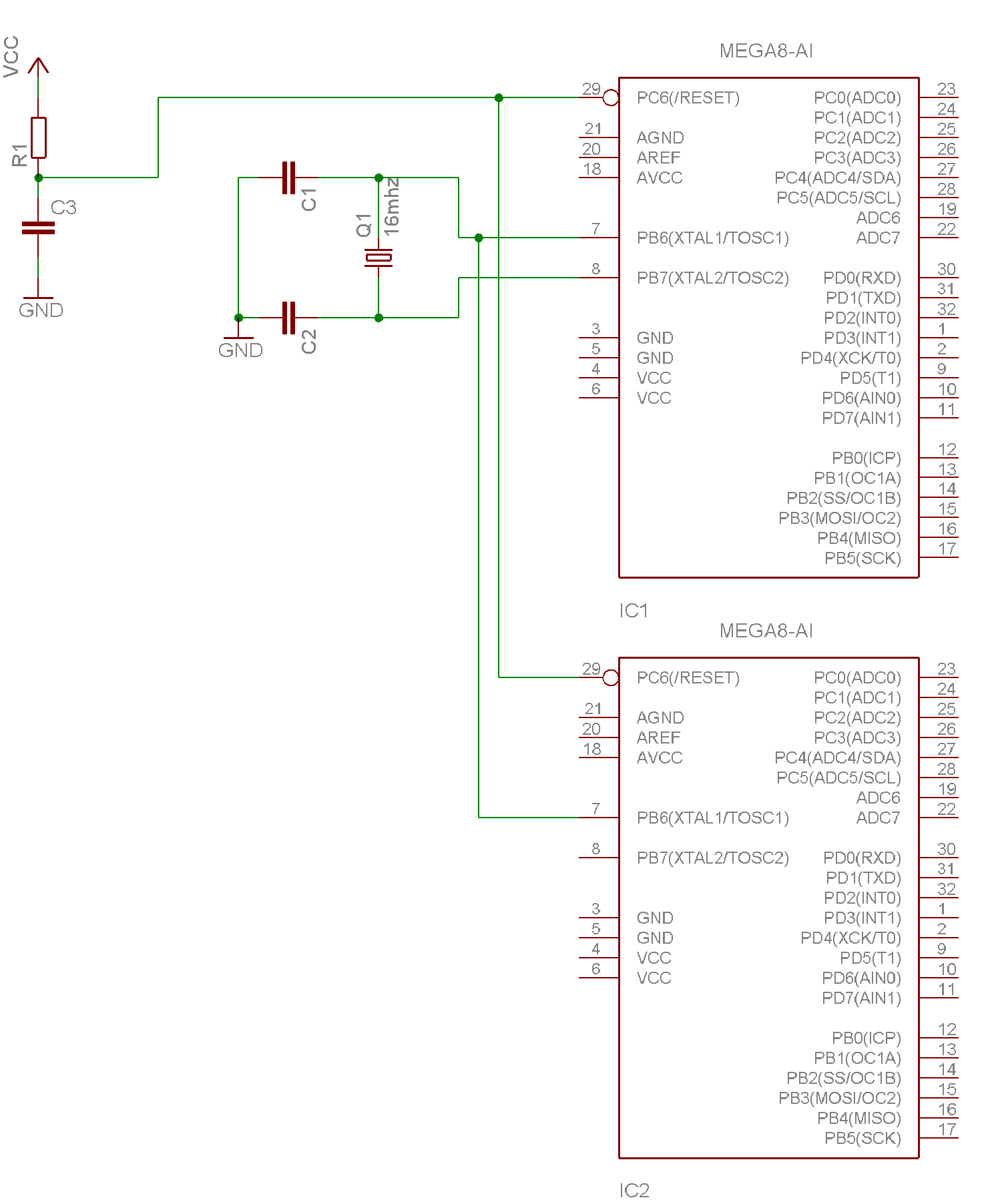 besser wäre , den Ausgang XTAL2 des Oszillators mit dem Eingang XTAL1 des extern gespeisten Controllers zu verbinden, aber so wird es vermutlich auch noch schwingen.