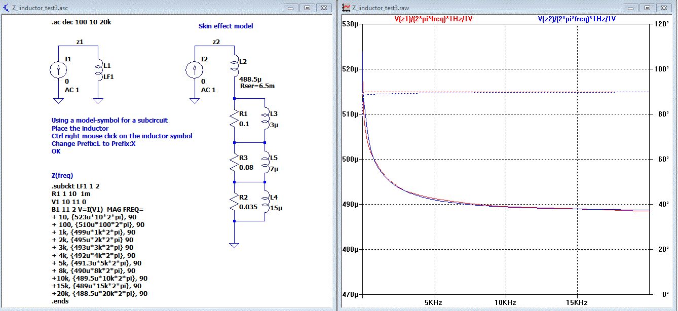Hallo Helmut, die Simulation soll tatsächlich als .AC Analyse betrieben werden. - Kannst du eine verständliche Anleitung zur Erstellung von freq-tables empfehlen? - Bzgl. des Skin effekt modell, hast du Erfahrungswerte genutzt oder kennst du einen allgemeinen Weg zur Approximation? Ich habe nun eine weitere Frage und ich vermute, dass du schon mit dieser gerechnet hast :) Besteht die Möglichkeit, ebenfalls die Stromabhängigkeit zu Simulieren? Wie du sicher schon gesehen hast verhält sich die Spule von 0 bis 10 A gleich, danach verliehrt sie einen Teil der Induktivität. Den Stromverlauf habe ich in der Grafik der Induktivität ( zweite y-Achse) ergänzt. Des Weiteren habe ich den gemessenen ohmschen Widerstand hinzugefügt. Dieser macht nur einen kleinen Teil der Impedanz aus, aber würde eine weitere Verbesserung der Simulation bedeuten. Beste Grüße, Hochachtungsvoll, Philip