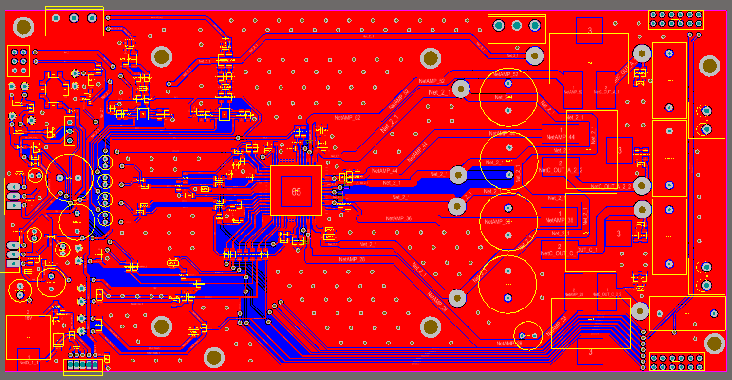 Hi Florian, mit welcher Quelle speist du den TAS5630b denn? In deiner Beschaltung wie sie auch im EVM verwendet wird kannst du mit einem normalen MP3 Player oder Handy den Amp nicht "ausfahren". Du musst entweder das Signal nochmal extern vor verstärken oder den bereits verwendeten Preamp (OPA1632) mit einem höheren Gain verwenden. Schick doch mal ein Sinus Signal rein, dann erkennst du am Oszi ja ob und wann der Ausgang voll ausgesteuert wurde. Die Spulen sind meiner Meinung nach etwas zu knapp kalkuliert (für die volle Ausgangsleistung) und mit 5,61mOhm jetzt auch nicht die effizientesten aber sie sollten passen. Wie warm werden sie denn? Offset am TAS5630b hatte ich übrigens auch schon, da waren die Eingangselkos des OPA1632 verkehrt eingelötet. Tausch mal deine Kerkos gegen Elkos und achte auf die Polarität. Nur eine Vermutung. Läuft beim Eingang denn der Offset auch weg? Achja es sieht so aus als hätten zwei der vier 680nF Filter C's keine Verbindung zu GND. Ansonsten sieht das Layout allgemein sehr abenteuerlich aus. Warum weichst du so krass vom EVM ab? Also ich seh jetzt BOTTOM nicht aber TOP sieht etwas zusammengewürfelt aus. Ich persönlich würde auch einen viel kleineren Kühlkörper verwenden. Wenn eh schon mit Lüfter dann muss der nicht so fett sein. Das gibt nur unnötig Probleme weil man die Spulen und Elkos so weit weg vom IC hat. Insgesamt muss ich aber auch sagen dass der TAS5630b anfällig ist und mir auch schon einige Exemplare gestorben sind. Es ist extrem wichtig sich an die Vorgaben von TI zu halten. Vor allem wenn man die vollen 50V Versorgunsgspannung ausnuten möchte. Mit einem TAS5624a z.B. hatte ich bisher noch keine Probleme.