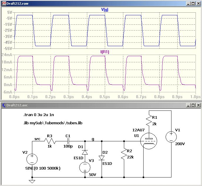 @ Frank Wa: ja Nochmal weils im Bild verwirrend ist: es werden GI7B verwendet, die Kapazitäten im Modell habe ich angepasst. Ein paar GI7B als Versuchsobjekte habe ich übrigens bestellt. @ Bernd Die 14 A Anodenstrom waren natürlich übertrieben, genauso wie die Gitterspannungen; ich wollte nur das Prinzip zweigen. Ansonsten möchte ich schon weit über den spezifizierten Strom gehen, weil der ja nur bei sehr geringer Anodenspannung fließt und daher auch wenig Verlustleistung erzeugt. Die Schaltung ohne Schwingkreis habe ich mal angehängt. Allerdings glaube ich, dass dieser essenziell dazugehört, weil mit Schwingkreis der Anodenstrom eben auch ohne Abfall der Anodenspannung herunter geht. In "Gesamt.png" sieht man bei 90,6 µs recht schön, dass die Triode im Stromnulldurchgang in Sättigung gerät, das ist bei rund 30 V Gitterspannung. Die Effizienz der Schaltung beträgt übrigens rund 75 %. So, Optimismus mal ausgeschaltet. Die Gitterspannung von -210 / 90 V ist natürlich unsinning, außerdem verstehe ich nicht wieso sie bei 90 V nicht weiter sinusförmig ansteigt. Und der Gitterstrom von 700 mA peak bei 90 V ist vermutlich auch nicht ganz ok... Weitere Ideen: fällt euch eine Möglichkeit ein, die Gitterspannung (HF 1 bis 30 MHz) rechteckförmiger zu bekommen? Gibt es eine Möglichkeit, die Frequenz "mechanisch" zu dritteln? Dann könnte man die Endstufe auf der 3. harmonischen betreiben. Viele Dank und Grüße Bernhard