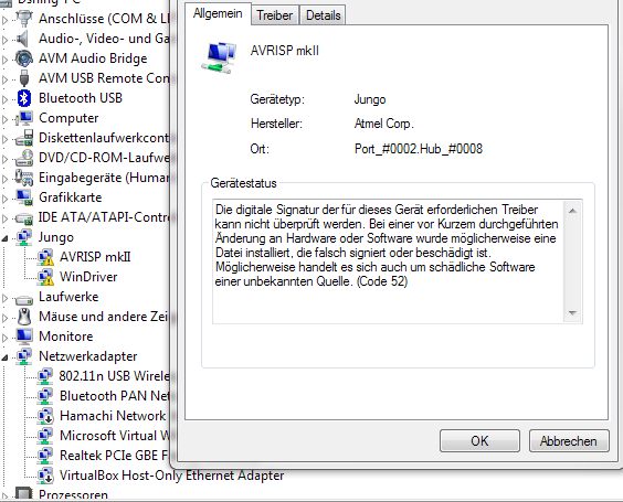 Ich hatte das gleiche Problem, trat bei mir nach dem Upgrade auf Win10 auf. Meine Lösung: 1) Alle Geräte im Geräte-Manager unter der Rubrik "Jungo" deinstallieren 2) avrispmkii.inf im Ordner X:/Windows/INF/ löschen 3) PC Neustarten 4) avrjungousb herunterladen und AtmelUSB.exe starten und installieren (repair) 5) MkII anstecken 6) Im Geräte-Manager rechtsklick auf windriver bei jungo -> treibersoftware aktualisieren -> auf diesem computer suchen -> aus einer Liste von Gerätetreibern wählen -> da müsste dann irgendwo rechts der mkII auftauchen, dann installieren und es ging bei mir