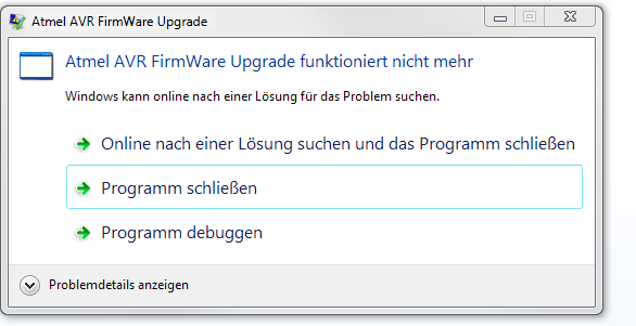 Hallo, nach einem erfolglosen Versuch einen Treiber für den MKII für ein Arduino zu installieren, so wie es hier beschrieben steht: Beitrag "Re: "AVRISP mkII" Programmer mit der Arduino IDE" Hab ich mir anscheinend die Treiber völlig zerschossen(Bild->Unbekannt). Der MKII wird zwar irgendwie erkannt, aber wenn ich das Atmel Studio starte und das Device Programming Fenster öffnen will, dann gibt es mehrmals hinter einander eine Fehlermeldung(Bild->Firmware), dass der Firmwareupdater nicht mehr funktioniert. Klickt man das ein paar mal weg und versucht was zu programmieren[Apply], kommt die Fehlermeldung 20100(Bild->Fehler). Ich hab schon ein paar mal alles neu installiert und versucht die Treiber sogar per Hand überall raus zu löschen und neu zu installieren, aber es läuft am Ende immer wieder auf das Gleiche hinaus. Ich hab dann auch schon das Studio 6.2 versucht, sonst nehme ich immer 6.0, aber dass stürzt komplett ab, wenn man es starten will. An einem anderen Rechner funktioniert der MKII noch ohne Probleme. Habt ihr eine Idee, was ich noch versuchen kann?