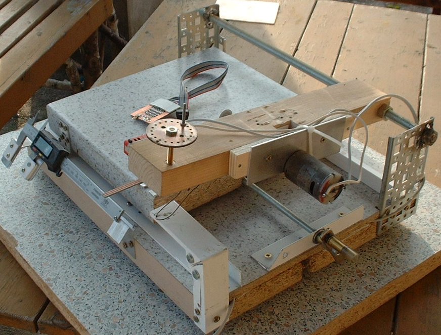 > Dann bau doch mal die Fräse von Hannes nach das ist wenigstens > erfolgversprechend :) Inzwischen benutze ich statt der Platinenfräse immer öfters meine zweite Platinenflex (Anhang). Das Ding hat einen verstellbaren Tisch mit Anschlag (Handkurbel, M8-Spindel), dessen Einstellung ich mittels angepapptem ALDI-Messschieber digital ablesen kann (auch in Zoll!!). Da die Tiefe des Schnittes (Diamant-Trennscheibe, 0,7 mm dick) exakt einstellbar ist, macht das Teil super Trennlinien bei einem Vorschub (Schnitt-Tempo, Durchschieben am Anschlag von Hand) von etwa 50mm pro Sekunde. Das geht für grobe Sachen besser und schneller als die Fräse. ...