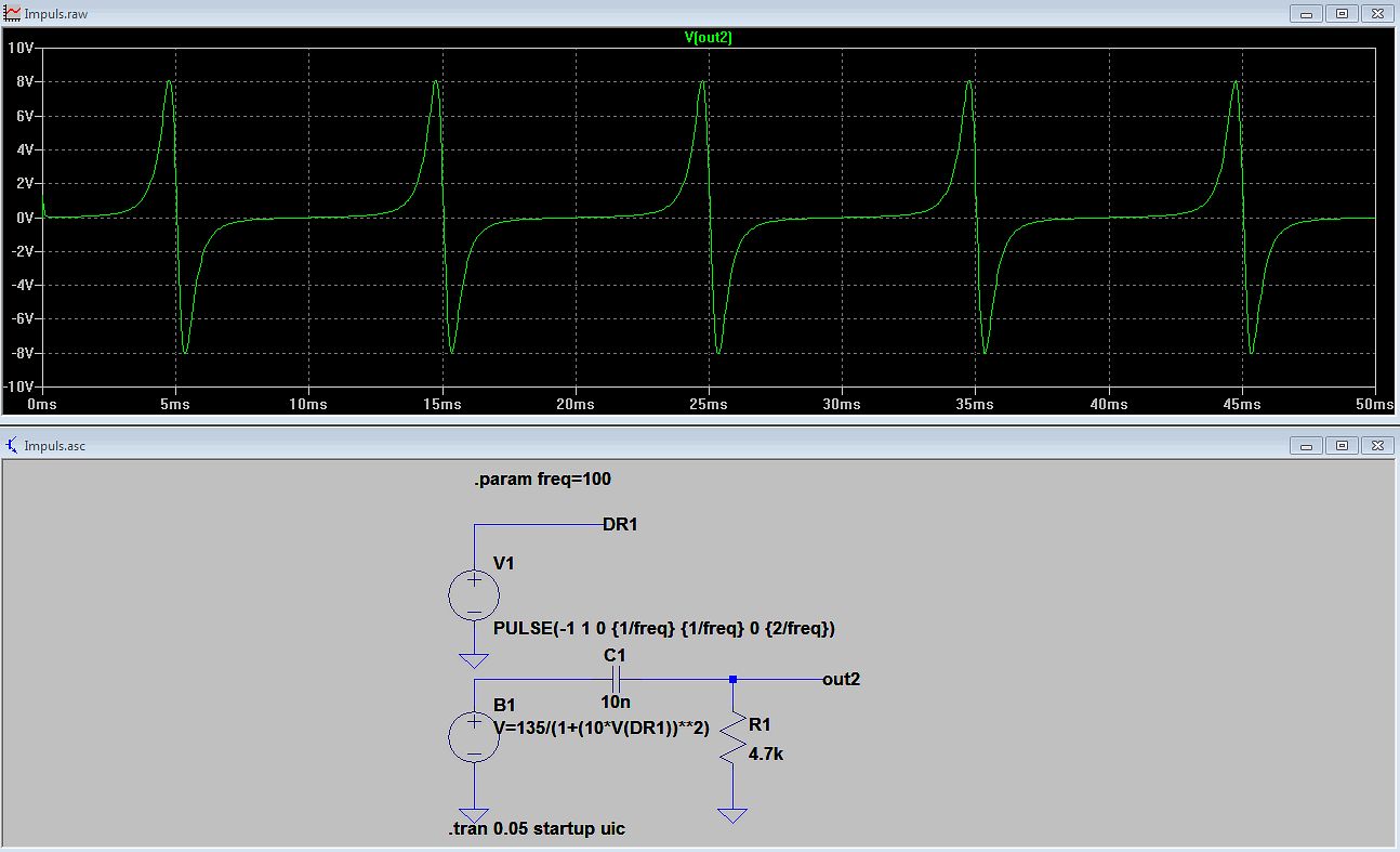 Hallo zusammen, ich hätte eine (für einige wohl banale) Frage und zwar möchte ich gern das Gebersignal meiner Zündung in LT Spice darstellen. Das sowas geht sah ich an diesem Thread: Beitrag "Re: Schaltung zur Simulation zweier Impulsgeber". Die Frage ist, ob ich ähnliches in LT Spice einbauen muss, damit ich so einen Spannungsverlauf wie im Anhang dargestellt ist, erziele? Für Anregungen bin ich dankbar (: Für den Anfang kann ich eine Rechteckspg. verwenden aber das spiegelt nicht die Wirklichkeit wieder. Grüße Tobi