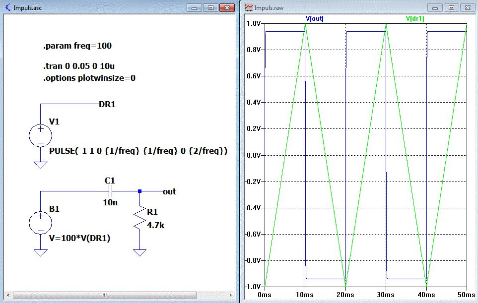 Hallo, eine Rechteckspannung kannst du mit einer Spannungsquelle mit den Einstellungen "advanced", "Pulse" und den gewünschten Parametern für Spannung und zeitlichem Verhalten abbilden. Beliebige Signalformen lassen sich auch mittels einer "PWL"-Datei abbilden. Gruß Otto
