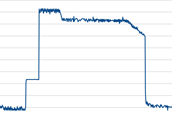 Hallo Elektroniker Wir haben folgendes Szenario aufgebaut: Ein ATMega328 steuert einen Motor an, welcher ein Ventil öffnet und schließt. Der Motor stoppt automatisch, wenn das Ventil ganz offen oder geschlossen ist. Was wir möchten, ist den Durchfluss regulieren. Wenn das Skript den Motor startet, gibt es zuerst eine kurze Leerlaufphase, dann die Phase, wo der Motor das Ventil drückt und die Endphase. Gut zu sehen ist das in der Grafik, die uns Excel erstellt hat. Aufgetragen ist die Spannung über die Zeit (10 Werte pro Sekunde) Nun möchten wir im Skript z.b. 3 Stufen einstellen, welche einen unterschiedlichen Durchfluss ergeben. Das Problem wird sein, dass wir damit auch an Ventile gehen müssen, welche wir vorher nicht testen können. Daher muss der kleine µC diese Aufgabe selber schaffen. Er muss also die Start und Endpunkte der 2. Phase erkennen und diese dann nach unserem Schema unterteilen (Ventil ist nicht linear). Habt ihr dazu Ideen? Reicht die Rechenleistung des Mega328 dafür überhaupt? Wenns ne Minute dauert ist OK. Gruß und Dank an das Forum, seine Leser und Schreiber. Kolja