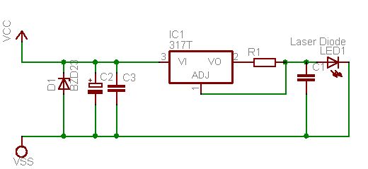 So hier die Ergebnisse: Die Diode läuft bis jetzt wunderbar. Die Helligkeit des unfokussierten Strahls entspricht in etwa der einer superhellen roten Leuchtdiode. Die Schaltung ist ganz billig: einfach ein mehrere uF Elko und ein kleiner Cap vor dem LM317 (siehe Schaltung oben) gegen Gnd. Davor noch ein 6 Ohm Widerstand. Der dadurch entstehende Tiefpass unterdrückt sogar die heftigen Störungen die entstehen, wenn ich das Netzteil an und aus schalte. Z Diode ist rausgeflogen, brauchen wir nicht und auch sonst nichts weiter notwendig. 100 mA scheint die Diode auf Dauer (1 h) gut zu verkraften. Viele Grüße und nochmal danke für die Hilfe, Markus