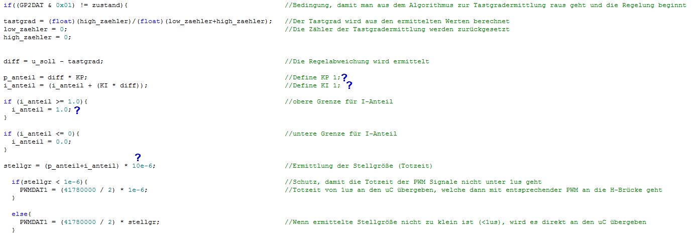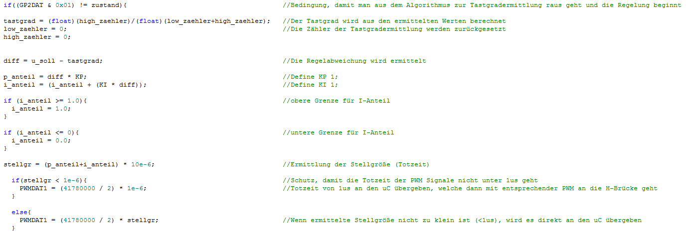 Hallo Leute, also ich habe die Spannungsmessung nun wieder am laufen. Bin nun wieder bei der Regelung. Da die Spannungsmessung anständig läuft, konnte ich bereits einige Ergebnisse erzielen, welche mich leider noch nicht zufrieden stellen. Ich habe es hinbekommen, die Spannung auf den 100mV Bereich genau zu regeln (die Spannung springt +-100mV am Multimeter). Was jedoch nicht klappt ist, das die Regelung auf mein Sollwert regelt. Bedeutet, wenn ich den Sollwert als 4,5V vorgebe, regelt es auf 6,8V. Das Problem, welches ich habe, liegt darin, dass ich die Regelgröße als Tastgrad einer PWM bekomme und die Stellgröße als Totzeit einer PWM rausgeben muss. Ich finde einfach nicht die passenden Stellungen der Parameter (siehe Fragezeichen im Bild) Ich bekomme die gemessene Spannung als PWM, welches einen Tastgrad von ca. 0,52 (ca. 15V) bis 1 (ca. 3,5V) haben kann. Unter 0,5 bekomme ich nichts, weil bei einem Tastgrad von 0,52 meine Maximalspannung anliegt. (unter 0,5 fällt es auf 0 ab, sprich die Regeldifferenz wird maximal, weil der uC denkt, die Spannung sei ins unendliche gestiegen). Da ich vorher gemessen habe, bei welchem Tastgrad ich welche Spannung habe, weiß ich welchen Tastgrad ich als Sollwert für die Regeldifferenzberechnung angeben muss. Wenn ich nun die Regeldifferenz habe (welche maximal 0,5 sein kann), berechne ich daraus die P- und I-Anteile. Hier komme ich leider auf keine gute Kombination der Parameter. Aktuell liegt mein Ki und Kp bei 1. Der Wert, die Stellgröße multipliziere ich mich 5us um die Totzzeit zu erhalten und die I-Anteil Begrenzung liegt bei 3,1. Ich kann die Totzeit bis maximal 16us einstellen. Das würde nach einigen Zyklen bei einer Regeldifferenz von 0,05 bedeuten stellgr = (0,05 + 3.1) * 5us = 15,75us. Also kann mit diesen Einstellungen fast über den gesamten Bereich der Tastgradeinstellung gleiten. Weil der I-Anteil zwischen 0 und 3.1 variieren kann. Der P-Anteil korrigiert in einem sehr kleinen Bereich die differenzen. Liege ich damit falsch oder warum will es nicht sauber gelingen? Danke