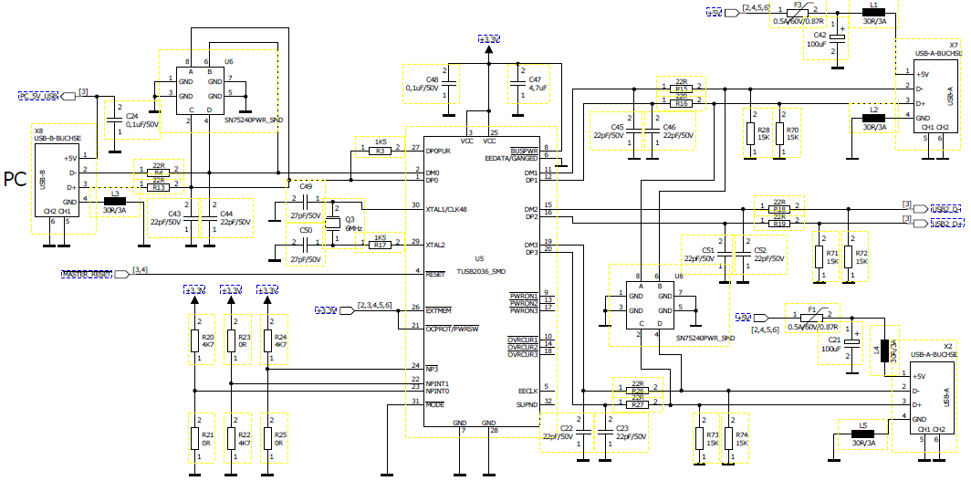 Hallo Leute, Ich habe folgendes Problem ich habe mir einen USB Hub designed (Schaltplan im Anhang) dieser funktioniert auch soweit ganz gut. Jedoch wenn ich ein Arduino Due über den USB OTG Port mit dem HUB verbinde dann bekomme ich die Meldung von WIN7 dass, das Gerät nicht gestartet werden kann (Code 10). Wenn ich nun das Ganze an meiner alten XP Kiste probiere funktioniert die Device-Erkennung problemlos. VID und PID Nummer werden unter WIN7 zwar richtig gelesen aber es bleibt als USB-Verbundgerät im Gerätemanager stehen. Lediglich die MI_00 Nummer fehlt unter der Hardware-ID. Die Treiber des Due sind unter Win7 auch richtig installiert, da es sich sofort richtig anmeldet wenn ich das Board direkt an den PC hänge. Nur in Verbindung mit dem HUB habe ich Probleme. Der zweite USB-Port (USB-UART) des Boards wird auch über den HUB sofort erkannt unabhängig vom Betriebssystem. Hatte von euch schon jemand ein solches Problem? Vielen Dank schon mal für die Antworten.