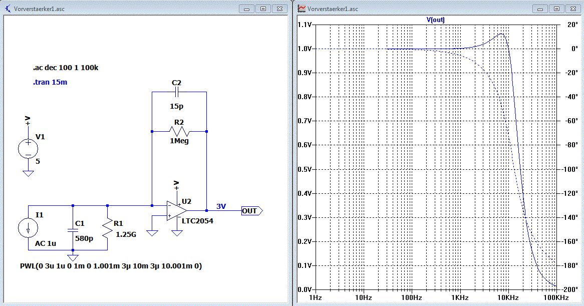 Hallo, ich versuche mich zur Zeit an LTSpice und würde gerne die Schaltung aus dem Anhang damit simulieren und die in realität gemessenen Werte mit der Simulation vergleichen. Zu der Schaltung: Es wird der Strom einer BPW21 Fotodiode (Hoffentlich richtiges Ersatzschaltbild am invertierenden Eingang des OP) verstärkt und in eine Spannung umgewandelt. Problem: Die Ausgangsspannung ist in der Simulation um den Faktor 3000 kleiner als die in Realität gemessenen Werte. Woran kann das liegen? Es wäre toll wenn ihr mir außerdem verraten könnt wie ich zusätzlich zu der Sprungantwort auch noch das Bode-Diagramm plotten kann. Bin für jeden Tipp dankbar :)