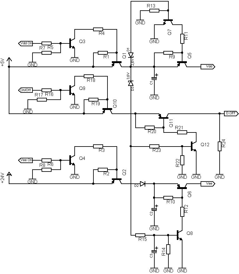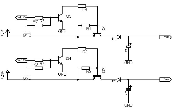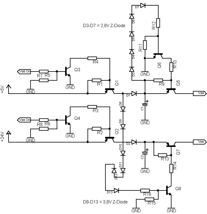 Hi, so nun habe ich meine Experimente so gut wie abgeschlossen. Ich habe meine alte Schaltung genommen und die Z-Dioden Idee von Blubb darin realisiert. Sobald die Vdd (5V) auf 4V zusammengebrochen ist (am C von Q1) wird Vee (24V) von der Spannungsversorgung und dem Elko abgetrennt (Q7 sperrt). Sobald Vdd (5V) auf 3,8V zusammengebrochen ist (an C1) wird Vdd (5V) vom Elko abgetrennt. (Q5 sperrt) Das hat den Sinn, daß sich Vdd nicht ewig lange auf 0V entläd. Ich hänge in den kommenden Post noch zwei Fotos von den Messungen an wo dieser Prozess anschaulich wird.