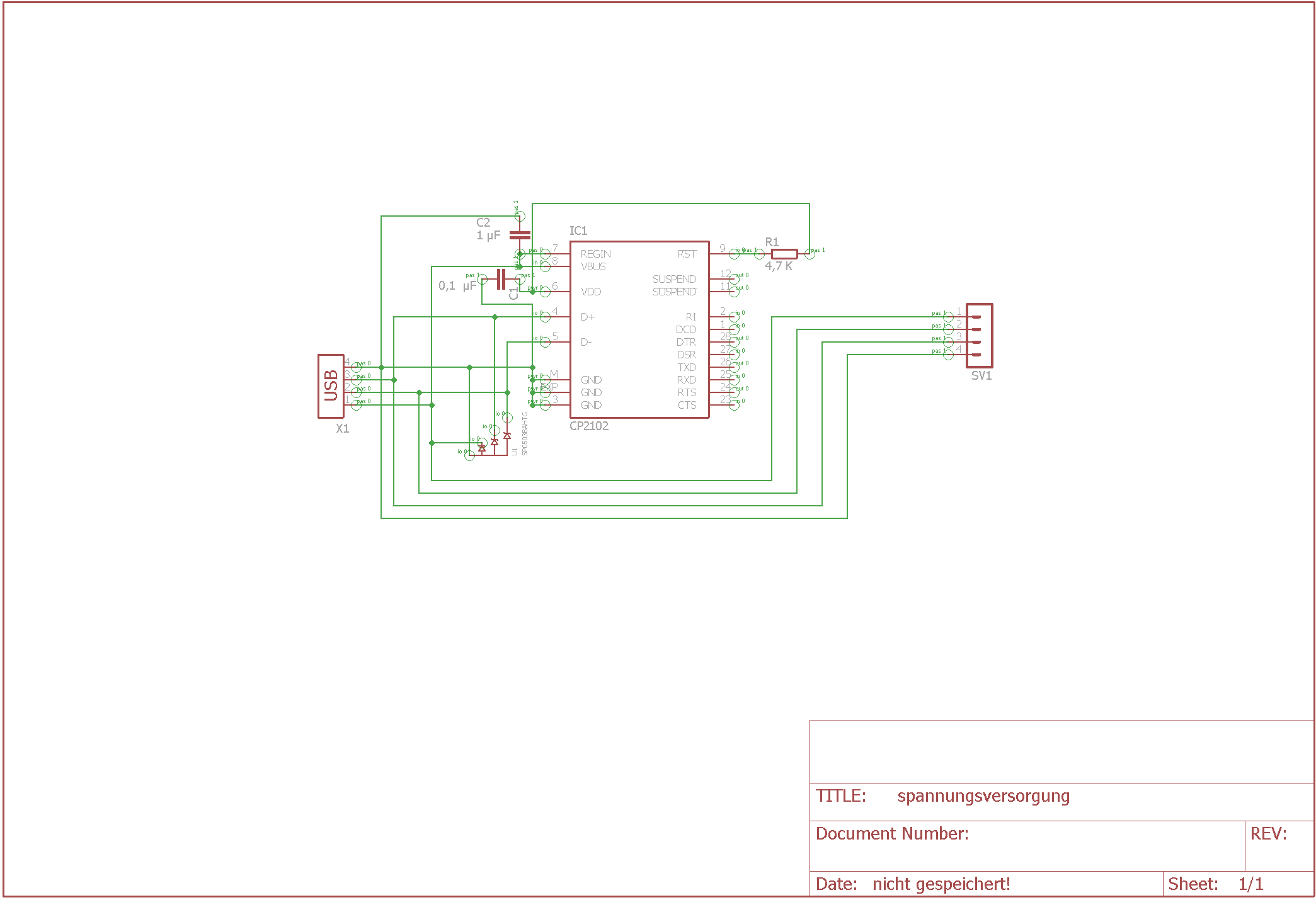 Hallo, ich brauche für meine Hauptplatine 5V und 300mA. Wenn ich meine Schaltung per USB am PC versorgen will benötige ich am besten ein CP2102. Habe mir das Datenblatt angeschaut,bin mir aber nicht sicher ob ich ihn verstanden habe. Ist die Schaltung so richtig? Von SV1 geht es auf meine Hauptplatine. Ich benötige den CP2102 nur, damit ich vom Host 300mA anfordern kann. http://www.farnell.com/datasheets/1694195.pdf
