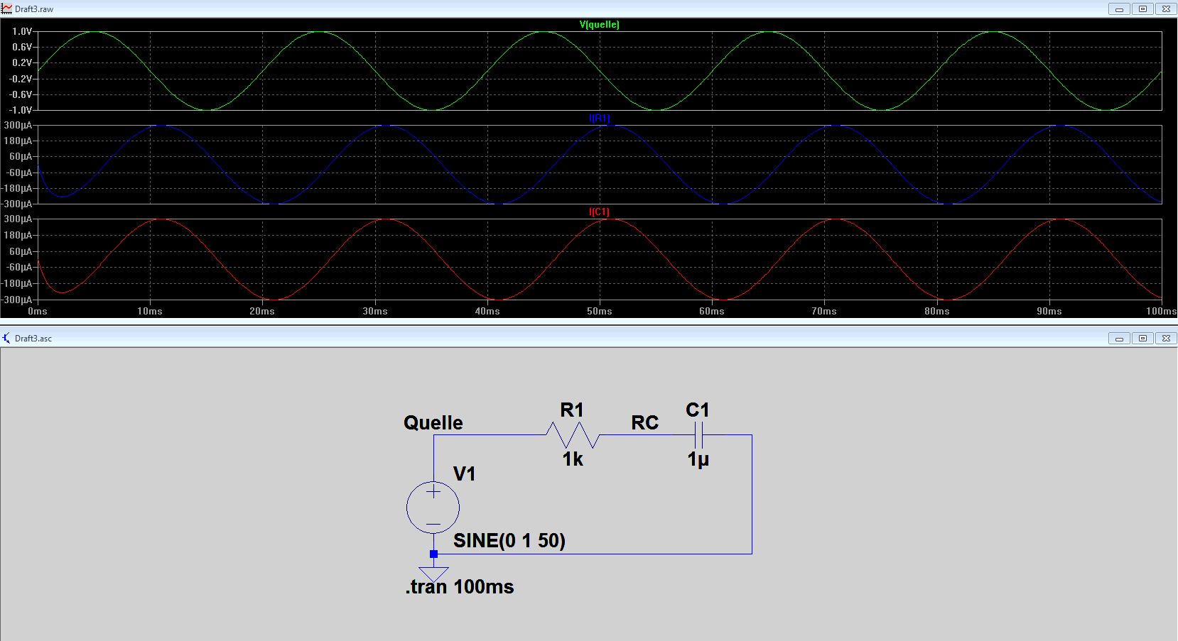 > Im Zeigerdiagramm lässt sich die Addition der phasenverschobenen > Spannungen am einfachsten verstehen. (Man muss halt dabei im Hinterkopf > haben, dass jeder dieser Zeiger eine sinusförmige Spannung > repräsentiert). Dein Zeigerdiagramm aus den letzten Tagen sah schon > nicht ganz verkehrt aus. Solange nichts an den Achsen steht ist > allerdings nicht festgelegt, was das Diagramm eigentlich anzeigt. Stimmt, habe ich vergessen einzuzeichnen. Nach oben natürlich Realteil und nach rechts der Imaginärteil. > Für Anschauung im Zeitverlauf würde ich dir LTSpice empfehlen (wurde ja > oben schon empfohlen und auch angewandt). Dann siehst du auch, dass ein > verzögerter Sinus halt auch wieder ein Sinus ist. Und dass ein Sinus, > der zu einem Sinus anderer Phase addiert wird, wieder einen Sinus > ergibt. Das ist mir durchaus bewusst, aber die Vorstellung was da wirklich passiert fehlt mir. Ich probiers nochmal: Spannungsquelle steigt an von 0V beginnend. Spannungsquelle "sieht" Kondensator (quasi Kurzschluss im Einschaltmoment) und Widerstand. Strom stellt sich ein (ca. U/R). Blindwiderstand C steigt allmählich. -> Spannungsabfall an C wird höher, Spannungsabfall an R wird niedriger Strom wird allmählich kleiner, da der Gesamtwiderstand steigt. Was ist wenn die Quellenspannung dann wieder abfällt. Normalerweise müsste sich die Spannung über dem Kondensator doch noch erhöhen, während Sie am Widerstand bereits abfällt. Ich hab das mal mit LTSpice simuliert und da fällt die Quellenspannung schneller bzw. gleich schnell wie die Spannung über dem Widerstand. Zusammen mit der Spannung über dem Kondensator haut das mit den zwei Spannungen, die sich zur Quellenspannung ergeben nicht wirklich hin. Ich hoffe das ist nur ne optische Sache. Bauteilwerte bei mir 200 Ohm 200µF bei 50 Hz Umax= 1V, 10s Simulationsdauer
