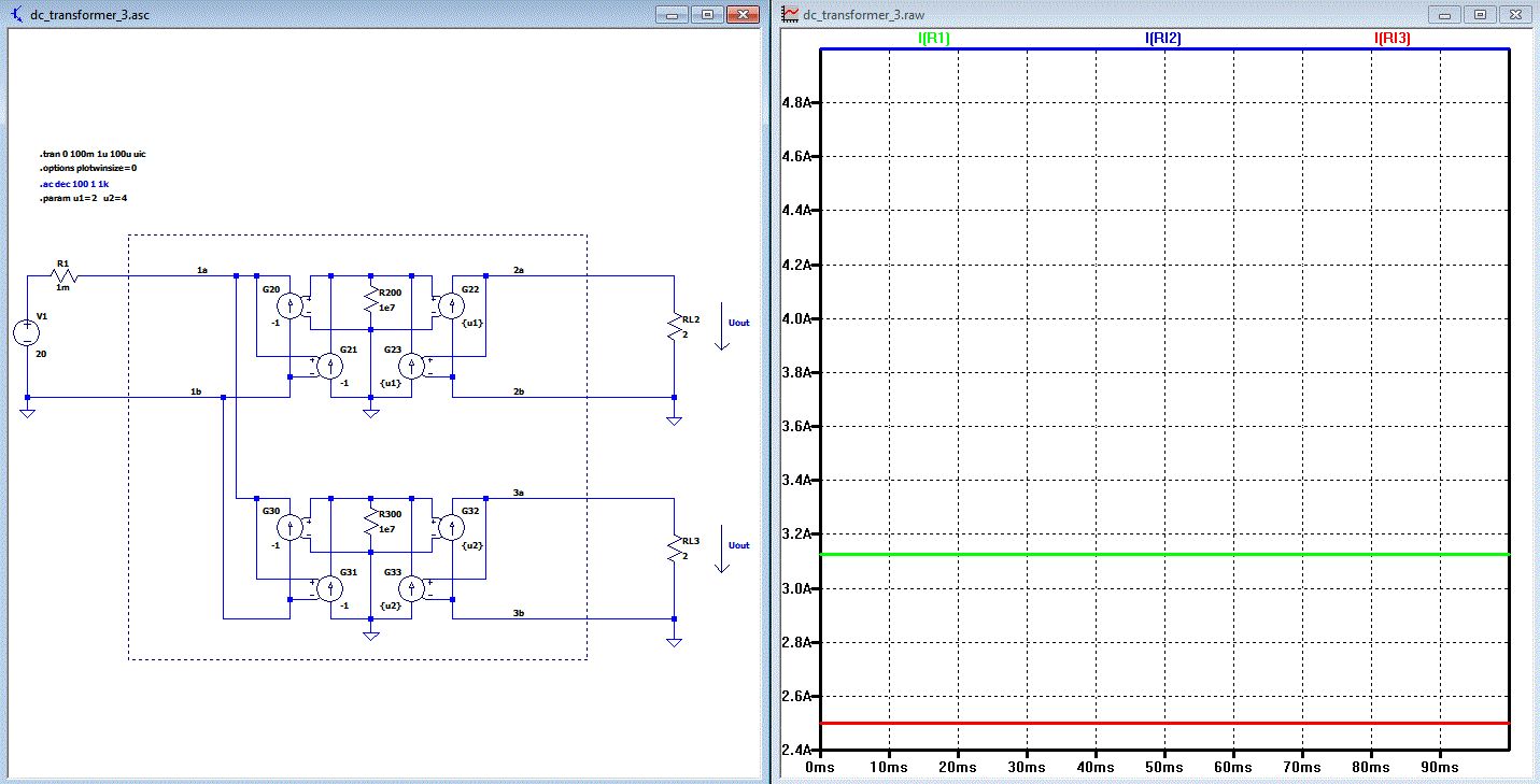 Die spannungsgesteuerte Spannungsquelle ist auch meine erste Idee, allerdings funktioniert sie nicht bidirektional wie ein Trafo. Falkls das gefordert wäre, müssten zwei spannungsgesteuerte Spannungsquellen funktionieren, die antiparallel über je einen kleinen Ausgangswiderstand angeschlossen miteinander verbunden sind. Theoretisch dürfte der Widerstand beliebig klein, aber nicht 0 sein und die Impedanz mindestens einer Seite darf nicht unendlich sein. In meinem SiMetrix Intro, mit dem ich simuliere, gibt es neben dem "normalen" idealen Trafo einen idealen DC-Trafo. Siehe Screenshot, obere Box. Damit ist das furchtbar einfach. arbi9 schrieb: > ..\LTC\LTspiceIV\examples\Educational\IdealTransformer.asc ... ist insofern wahrscheinlich nicht ideal, als dass immer noch eine endliche Hautinduktivität bleibt und dadurch reiner DC nicht übertragen wird. D. h., der Simulator findet die die "Initial Condition" (oder wie das heißt) nicht. Oder kann der auch DC, z. B., als Option? Klaus R. schrieb: > In der Simulation darf es keine galvanische Trennung zwischen Primär- > und Sekundärseite geben. Das ist richtig, aber wenn gefordert wird, dass der Ausgang auf eine beliebiges Potential gelegt werden darf, ohne dass dafür ein Strom fließt, wird dafür trotzdem ein Trafo bzw. hier ein idealer, DC-fähiger Trafo o. ä. gebraucht. Allein schon zum Bilden einer Differenzspannung, die dann auf und Masse bezogen werden soll. Grüße, Uwe