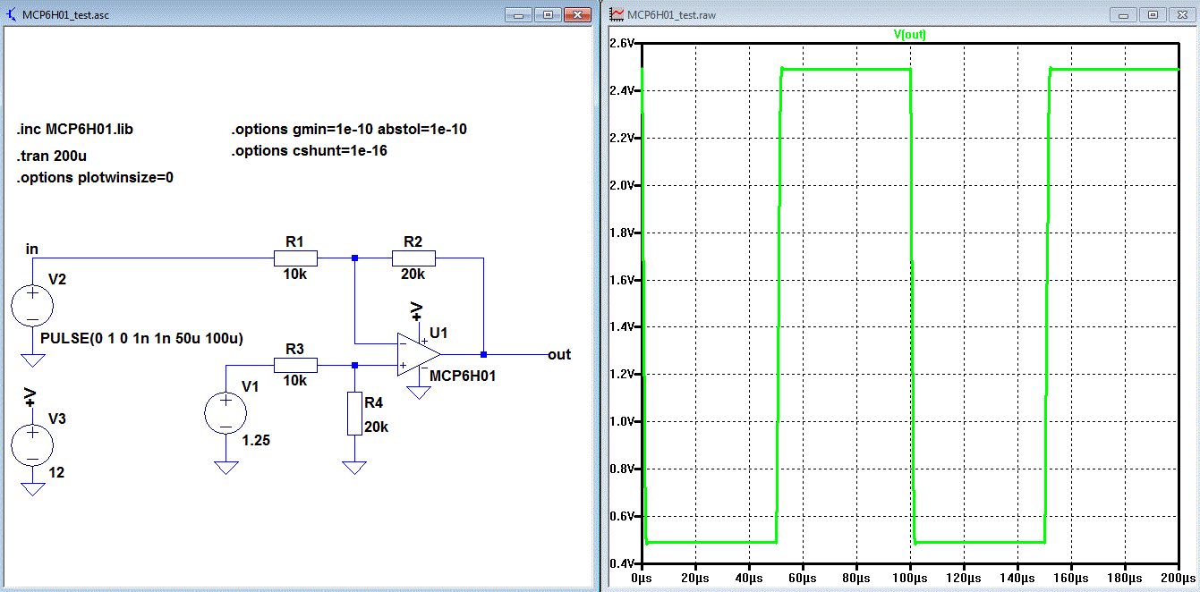 Hallo Olaf, alle Modelle von Microchip haben Konvergenzprobleme in LTspice. Manche gehen dann mit der Option cshunt. Ich habe das Symbol "opamp2" verwendet. Helmut