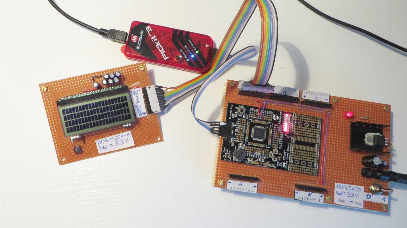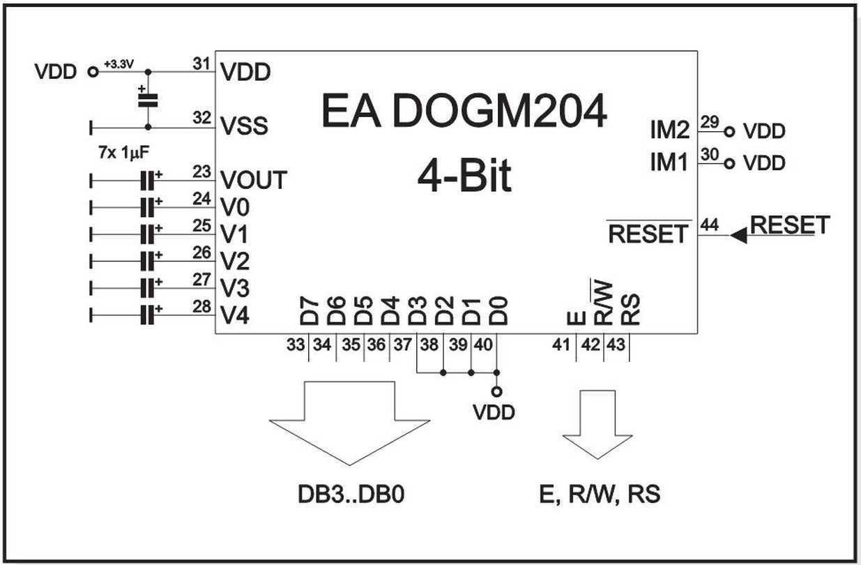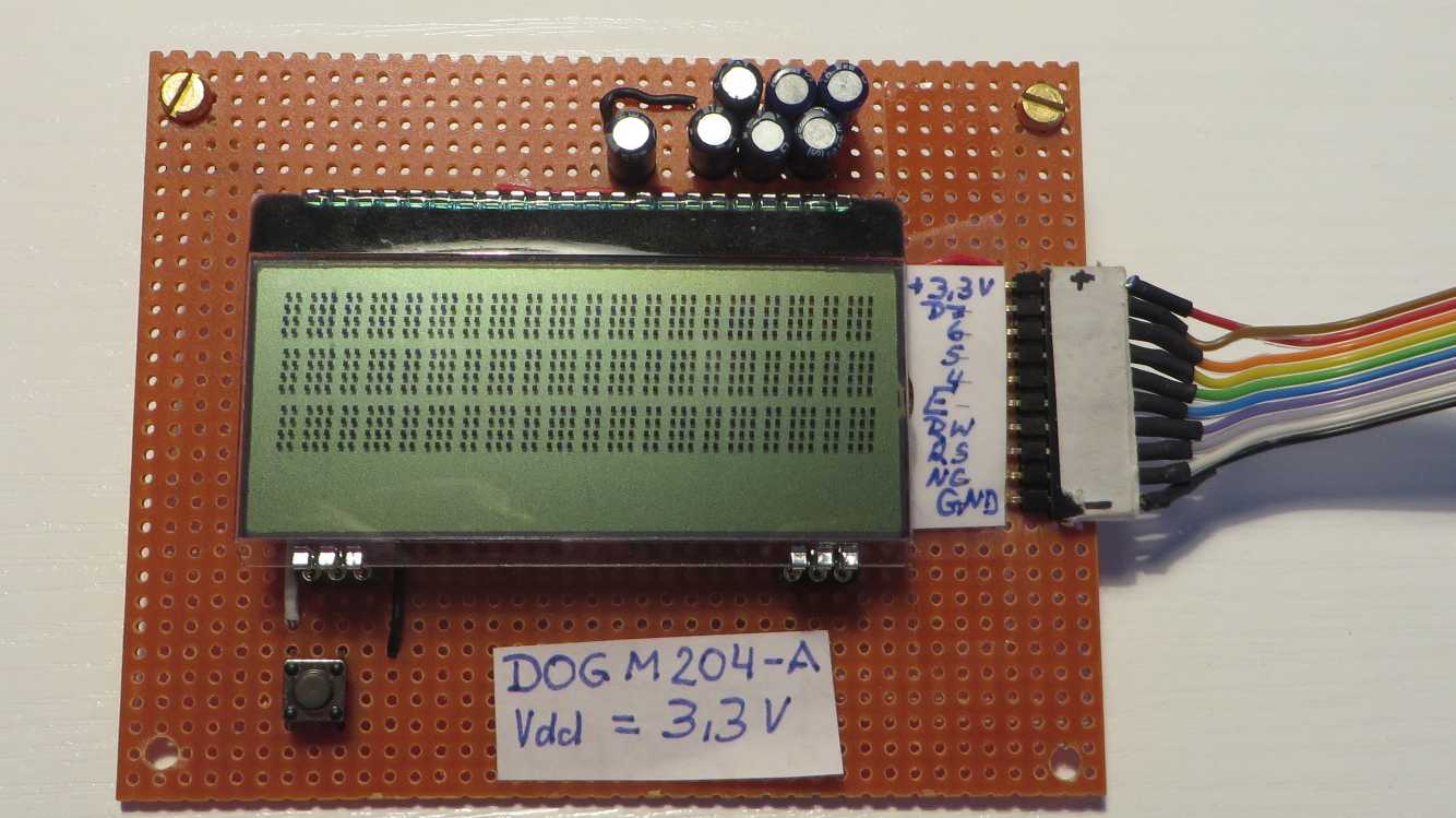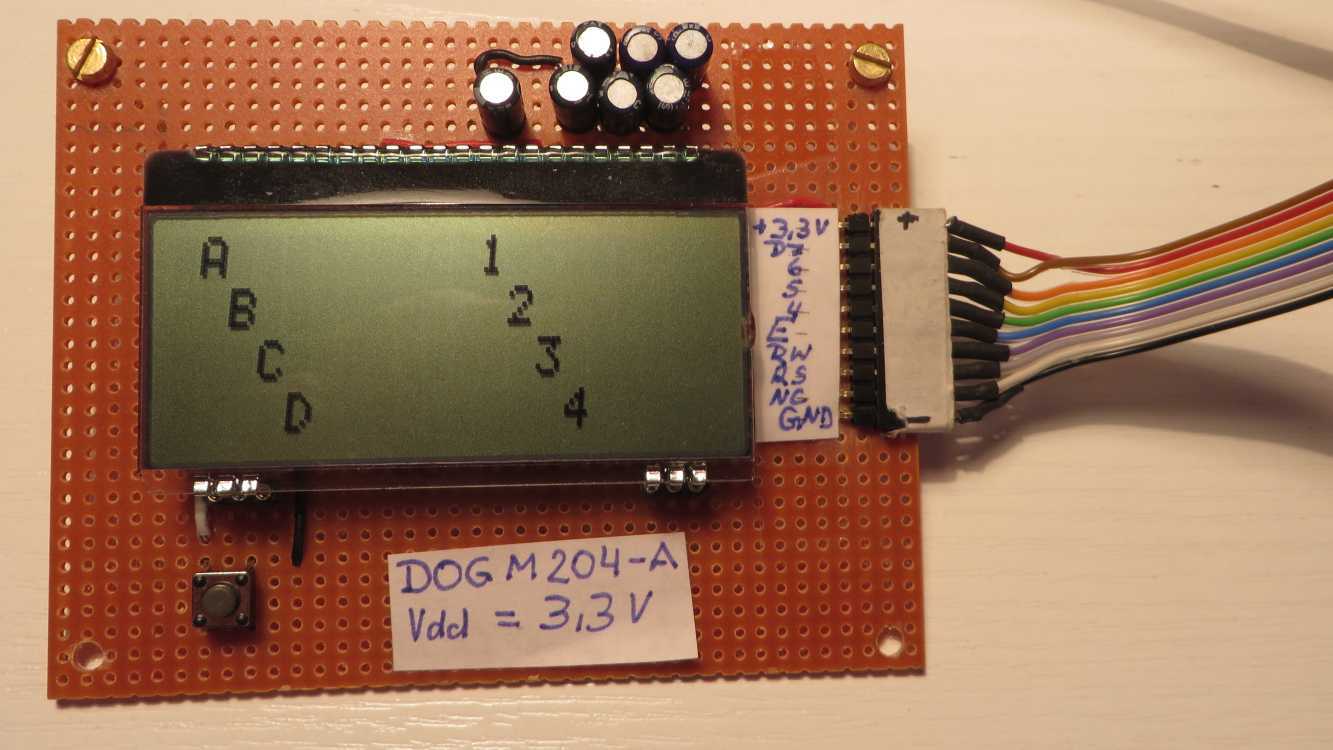 LCD EA DOGM204N-A spinnt? Seit einigen Tage bemühe ich mich mit dem PIC18F45K20 per Assembler (MPLAB 8.92) das LCD EA DOGM204N-A zum Arbeiten zu bringen. Den Code habe ich beigefügt. Die Beschaltung folgt dem Datenblatt von electronic assembly, Stand 2015.7 (siehe beigefügten Schaltplan). Ebenso folgt die Initialisierungssequenz dem Datenblatt wie in der Anlage ersichtlich. Nachdem dies erfolglos war, wird jetzt 3x im 8-Bit-Modus und dann im 4Bit-Modus initialisiert (vgl. ASM-File). Nach dem Einschalten der Versorgungsspannung (3,3V) zeigt das LCD entweder nichts oder aber gelegentlich und rein zufällig den Text, welchen das Programm vorgibt (siehe Anlage). Dabei läuft die Software sauber durch, wie ich an den im Programmlauf geschalteten Kontroll-LEDs erkennen kann. Schalte ich dann die Spannungsversorgung aus und schalte erneut ein, tut sich meist nichts, gelegentlich lässt sich ein schwaches Pixelmuster sehen, es kann aber auch sein, dass alle Zeilen mit kräftig schwarzen, vollen Digits belegt sind oder aber - welche Freude - der Vorgabetext wird wieder einmal fehlerlos ausgegeben! Wenn das LCD korrekt ausgibt, messe ich am den Anschlüssen mit dem DVM (Ri=10MOhm): Pin 31 Vdd 3,27V Sollwert=3,3V 32 Vss 0V (GND) 44 RESET 3,27V 23 Vout 11,90V 24 V0 10,16V 25 V1 8,39V 26 V2 6,74V 27 V3 3,39V 28 V4 1,76V Diese Spannungswerte sind stabil und verändern sich auch nicht während der Spannungsmessung. Schalte ich jetzt die Schaltung ab und dann wieder ein, bleibt die Anzeige meist leer und ich messe dazu an den Anschlüssen Pin 23 - 24 irreguläre Werte: 2,62V, 2,62V, 2,02V, 0,06V, 0,16V. Offensichtlich arbeitet die Ladungspumpe nicht. Hatte das Problem vielleich schon jemand und weiß Abhilfe? mfG Ottmar