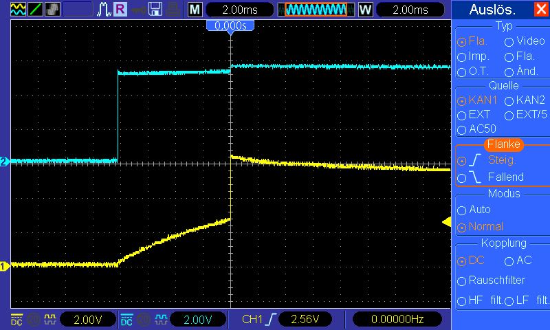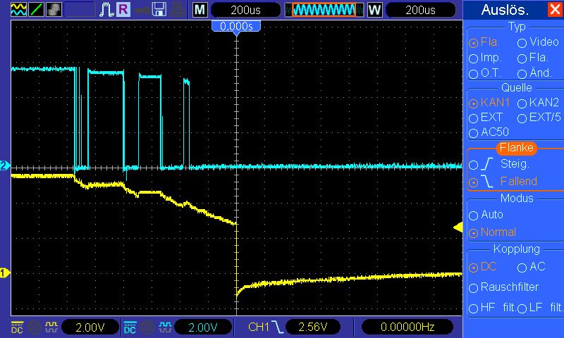 Anhand der im Forum gestellten Fragen wird deutlich, daß noch immer ein Interesse an Entprellung einzelner Taster per Hardware existiert. Vielleicht ist nachfolgende Schaltung nützlich. Es gibt viele Schaltungen, um Signale von Tastern mit prellenden Kontakten per Hardware aufzubereiten. Die typische Schaltung besteht aus einem RC-Glied mit nachgeschaltetem Schmitttrigger-IC, welches eine vorgegebene Hysterese hat. Allerdings besteht der Nachteil, daß diese je nach Schaltkreis und Hersteller deutlich schwanken kann. Ein weiterer Nachteil zeigt sich darin, daß bei kleiner Hysterese die RC-Konstante hoch gewählt werden muß, um sicher zu entprellen. Wählt man die Zeitkonstante zu klein, können Mehrfachimpulse erzeugt werden, wenn das Eingangssignal um die kleine Hysterese herum 'wackelt'. In der Praxis kann daher eine Schaltung, die hinreichend schnell schaltet, bei stark prellenden Tastern Probleme bereiten. Die alternative Schaltung (siehe Bild) vermeidet diese Nachteile, da beim Überschreiten der Schaltschwelle der Kondensator des RC-Gliedes nicht weiterhin langsam ent-/aufgeladen wird, sondern schlagartig umgeladen (entladen!) wird. Sobald der Umschaltvorgang ausgelöst wurde, werden Ein- und Ausgangsspannung des Schmitttriggers in einen definierten Zustand gebracht, als wäre der Taster schon lange gedrückt oder offen gewesen. Die Schaltung arbeitet mit zwei einfachen CMOS-Invertern, die in Reihenschaltung einen nichtinvertierenden Verstärker bilden. Somit sind Hysterese sowie Schaltverzögerung reproduzierbar einstellbar, ohne Abhängigkeit vom verwendeten IC oder dessen Hersteller. Schaltung: Abweichend zu herkömmlichen Lösungen fällt auf, daß der Kondensator C1 im Mitkopplungszweig der beiden Inverter liegt und mit R2 einen Tiefpass bildet. Der optionale Reihenwiderstand R4 dient dabei der Strombegrenzung, wenn C1 durch den geänderten Ausgangspegel an Q umgeladen und der Strom dabei über die Eingangsschutzdioden von IC1A abgeleitet wird. Nachfolgend soll R4 zunächst mit 0 Ohm angenommen werden (Drahtbrücke = gestrichelte Linie). Betrachtet man die Schaltung ohne den Pfad C1+R4, so ergibt sich die Hysterese der beiden Inverter aus R2/R3 bei geschlossenem Taster und (R1+R2)/R3 bei offenem Taster. Bei R2 = 10 kOhm ist die Hysterese beim Schließen des Tasters mit rund 1/100 * VCC und mit rund 1/50 * VCC beim Öffnen recht klein. Diese Hysterese macht aus den Invertern IC1A und IC1B einen Schmitttrigger, dessen Umschaltpunkt (vereinfacht) bei rund VCC/2 liegt. Funktion: Im Ruhezustand ist der Taster geöffnet und am Ausgang Q liegt VCC. Der Pegel am Eingang von IC1A liegt ebenfalls auf VCC; C1 ist voll entladen, beide Pole liegen auf VCC-Potential. Wird der Taster geschlossen, geht der Pegel an Pin1 von R2 auf GND-Potential, wobei Prellen auftritt. Da R2 mit C1 einen Tiefpass bildet, wird der Eingangspegel von IC1A verzögert bzw. gefiltert auf GND gezogen, sodaß die Prellimpulse den Schmitttrigger nicht schalten lassen. C1 wird dabei aufgeladen, wobei sein Pol zum Ausgang hin auf VCC bleibt, der zu R2 hin aber gegen GND geht. Das Bild "10k_schnell_ein.gif" zeigt das Signal des Tasters (R2-Pin1) in Blau und das am Eingang von IC1A (R2-Pin2) in Gelb. Da es sich um einen Taster mit vergoldeten Kontakten handelt, ist sein Prellen nach 1 ms schon abgeklungen. Zum Triggerzeitpunkt in Bildmitte schaltet der Ausgang Q auf GND-Pegel und damit über C1 den Eingang IC1A ebenfalls auf GND, wobei C1 über die Eingangsschutzdioden wieder entladen wird. Das Öffnen des Tasters ist im Bild "10k_schnell_aus.gif"gezeigt. Ein Prellen ist hier nicht zu erkennen. Wieder wird C1 aufgeladen, allerdings mit anderer Polung als beim Drücken des Tasters. Nach Erreichen von etwa VCC/2 gehen Ausgangspegel Q und über C1 auch der Eingangspegel von IC1A wieder auf VCC. Die Bilder "100k_langsam_ein.gif" und "100k_langsam_aus.gif" zeigen die deutlich größere Entprellzeit bei R2 = 100 kOhm. R4 wurde bislang mit 0 Ohm angenommen. Bei diesen letzten Bildern war er 1 kOhm groß. Ob man R4 einbaut oder nicht, hängt von den verwendeten Invertern ab. Die Bilder entstanden mit einem HEF4069 IC, dessen max. Ausgangsstrom seine Eingangsschutzdioden bei VCC = 5 V nicht überlasten kann. Bei Logikbausteinen 74HC40xx sind die Schaltzeiten deutlich kürzer sowie Ausgangsströme deutlich höher, sodaß eine Strombegrenzung mit R4 = 1 kOhm angebracht ist. Die Bauteile haben Standardwerte; die genauen Werte sind unkritisch. Die Verzögerungszeit kann auch durch Änderung von C1 angepaßt werden.