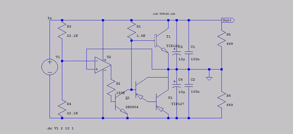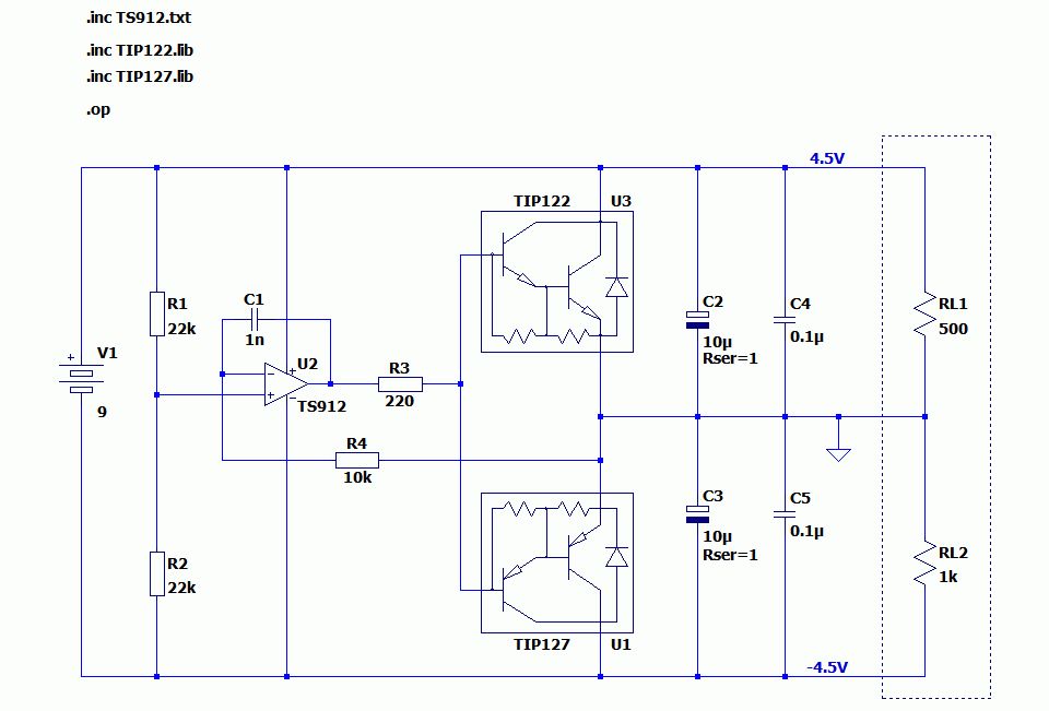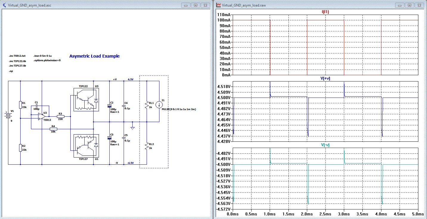 Das war jetzt nur mal ".OP"-Analyse. Da erscheinen nur die Arbeitspunkte. Beachte die "4.5V" und "-4.5V" (blauer Text). Ich mach dir mal ein Beispiel mit transienter Last und .TRAN-Analyse. Gib mir 5 Minuten.