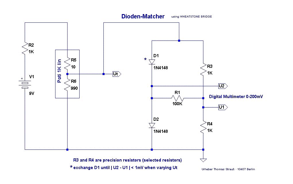 Hallo, ab und zu braucht man Dioden mit übereinstimmenden Daten. Das Selektieren - auch Matchen genannt - ist auf verschiedene Arten möglich. Man kann das mit der Diodenprüfung machen, was jedes Digitalmultimeter hat. Für genauere Messungen habe ich folgende Schaltung getestet, die auf der Wheatstone-Brücke basiert (erfunden nicht von Wheatstone, sondern 1833 von Christie) - siehe Schaltplan. Gruß Thomas