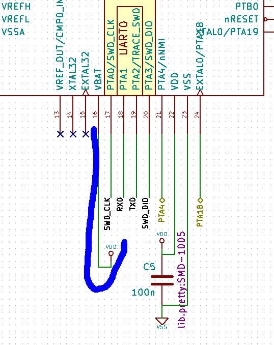Hallo W.S.! Freue mich über deinen ausführlichen Beitrag, ich habe jetzt etwas weniger Kopfschmerzen :-) Den NXP schaue ich mir mal an, ein integrierter Bootloader ist ja schonmal eine super Sache! Zu dem ARRL Handbook: das gibt es soweit ich sehe nur auf Englisch, nun interessieren mich z. B. die Unterschiede zw. den Bezeichnugen "Abblockkondensator", "Glättungskondensator", "Entprellungskondensator", was ja deutsche Fachbezeichnungen sind. Aber vielleicht ist es wirklich sinnvoller mit den englischen Bezeichnungen zu beginnen ... Thomas Eckmann schrieb: > Stützkondensatoren dienen der kurzfristigen Bereitstellung von einem > hohen Strom wenn der Controller schaltet. Das tut er ein paar Millionen > Mal pro Sekunde. PC-Prozessoren sogar Milliarden Male. Dieser Strom kann > vom Netzteil aber nicht so schell geliefert werden. Da spielen die > Leitungslängen eine Rolle. Deshalb kommt an jeden > Stromversorgungsanschluss ein Kondensator. In der üblichen Dimension > 100nF. Diese Kondensatoren werden auch als Abblock-, Block- aber auch > als Glättungskondensatoren bezeichnet. (...) Verstehe. Meine Frage kam daher, daß ich an einer Schaltung eines MK20LF sah, daß dieser überall mit einem 100n Abblockkondensator versehen war, bloß nicht am pin "VBAT", der direkt (ohne Kondensator) mit VDD verbunden ist: [Bild im Anhang]. Und Sie haben geschrieben > Am Controller, wie an jedem anderen digitalen Bauteil auch, jedoch > müssen unabhängig von der Stromversorgung immer Stützkondensatoren > vorhanden sein. Demnach müßte doch bei VBAT auch einer hin, oder?