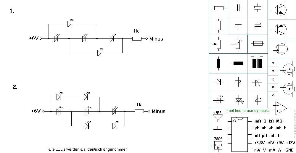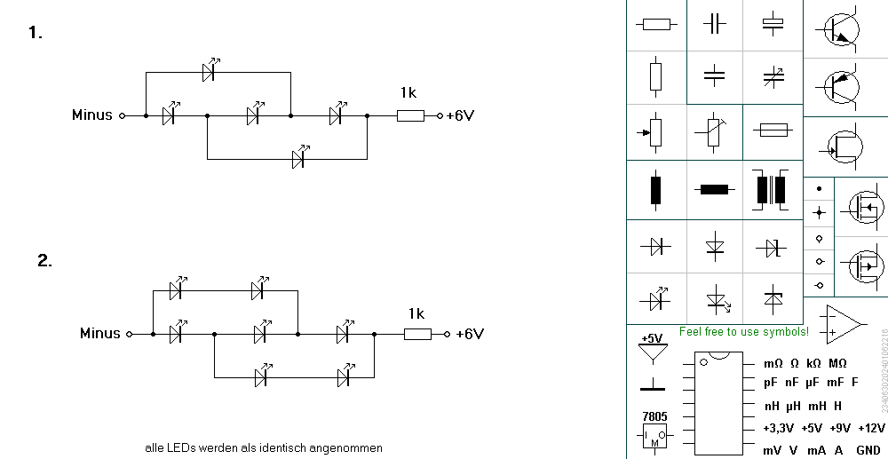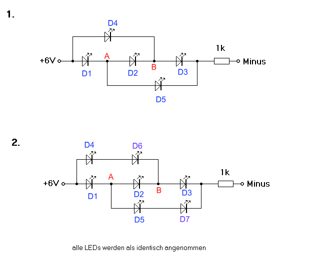 Zwei kleine Rätsel am Sonntag: Welche LEDs leuchten in 1 und welche in 2 (s. Anhang)? Die elektrischen Parameter aller LEDs werden als identisch angenommen.
