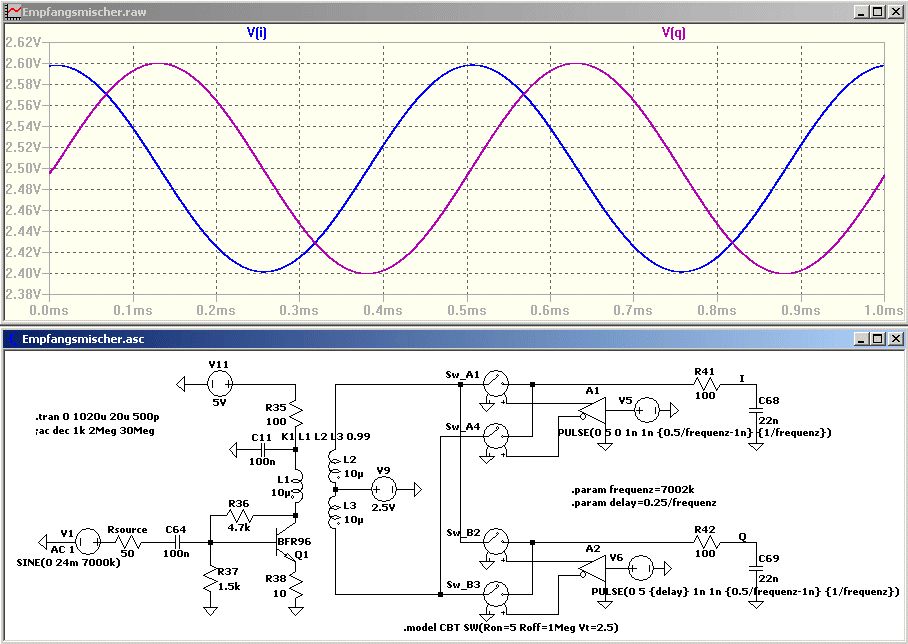 Hallo Bernd, ich bin leider nicht so ein Spezialist in Sachen LTSpice. Ich habe nach Deinem Vorbild angenommen, dass das CBT Modell bei Vt die Schwelle von ON/OFF angibt, und dass man sich nicht die Mühe machen muss ein phasenverschobenes Rechteck den Schaltern anzubieten. Sollte ich mit meiner Annahme falsch liegen, so muss ich doch wohl eine Rechteck definieren. Aus Deiner Simulationsdarstellung ist leider nicht hervorgegangen, wie die Oszillatortakte definiert sind. Kannst Du mal deine .asc Datei von LTSpice dranhängen. Ich habe mal meine drangehängt. Sie beinhaltet den Taylor-Mischer gleich zwei mal, um besser die Auswirkungen von Bauteiländerungen in einer Simulation darstellen zu können. vy73 Markus DL8MBY PS.: ich habe Dich erst jetzt verstanden. SW darf nur eine viertel Periode der Sinusschwingung an sein und nicht von Nulldurchgang zum Nulldurchgang (d.h. T/2). Werde dass anpassen. Markus