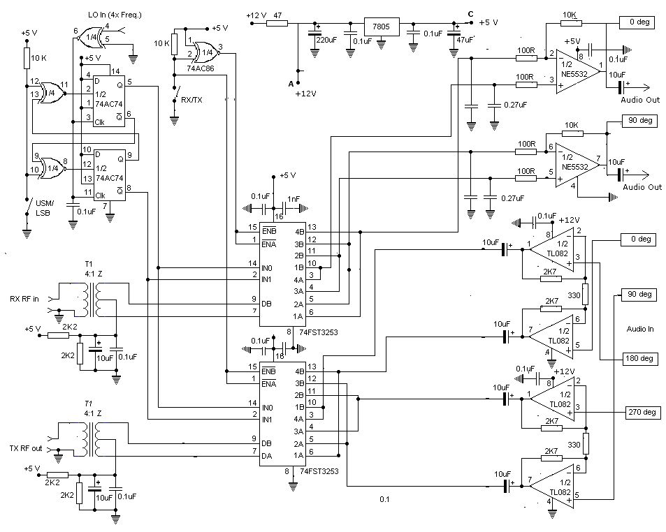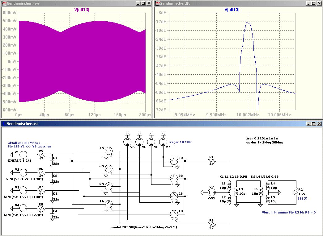 Hallo Markus Die Blockkondensatoren im Tayloe-Mixer-Schaltplan befinden sich am Übertrager, beim mcHF-SDR jedoch auf der anderen Seite. Ob das Absicht war, denn ansonsten sieht der Schaltplan wie eine 1:1 Kopie aus? Im Hinblick der Symetrie bin ich mir nicht auf Anhieb sicher, welche Variante das bessere Ergebnis liefert. Der Übertrager wird ja schon von einem symetrischen Signal gespeist. Möglicherweise sollen die beiden Kondensatoren nur Störungen aus der Betriebsspannung wegfiltern, ob die Impedanz hoch oder niedrig ist, ist möglicherweise egal. Dies würde für den Tayloe-Schaltplan sprechen. Dein Ausgangssignal enthält zwei identisch große Signale, die Seitenbandunterdrückung funktioniert nicht. Mach mal eine FFT und schau den Bereich um 10 MHz an. Die Schalter im "1-OF-4 FET MULTIPLEXER" dürfen IMO jeweils nur 1/4 der Zeit angesteuert werden, es kann immer nur einer der vier Schalter an sein. Bei Verwendung eines Sinus für V5...V8 ist jedoch jeder Schalter die Hälfte der Zeit leitend. Gruß, Bernd