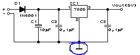 Hallo, bei unstabilisierten Netzgeräten bricht die Ausgangsspannung bei Belastung zusammen. Um das zu vermeiden benutzt man eine Stabilisatorschaltung wie sie auf dem Bild zu sehen ist. Da das Netzteil ja schon eine Gleichspannung liefert, kann die Diode entfallen. Den 10µF Elko würde ich allerdings auf 470µF-1000µF erhöhen, weil diese Netzteile meist nicht besonders gut gesiebte Gleichspannung abgeben und die Zuleitung zur Stabilisatorschaltung auch zu Spannungseinbrüchen führen kann. Das Steckernetzteil würde ich auf 7,5V oder auf 9V einstellen. Das eingekreiste Zeichen bedeutet "Masseanschluß", hier wird die Masse der zu versorgenden Schaltung angeschlossen. Man hätte wie waagerechte Linie auch weiterzeichnen können und den Masseanschluß ans Ende zeichnen können. Warum soll jemand böse werden? Jeder hat mal klein angefangen. Es grüsst, Arno