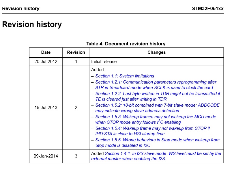 @Sascha dies ist, wie der name der Tabelle schon sagt, die Revision der Dokumentation und nicht des Chips. @Mehmet ich bezweifle dass es eine Tabelle als Übersicht aller Stm32 chips samt revisions gibt, zumindest extern zugänglich. Vielleicht wäre es besser du legst dich auf einen Chip fest und suchst danach. Oder worum geht es dir dabei?