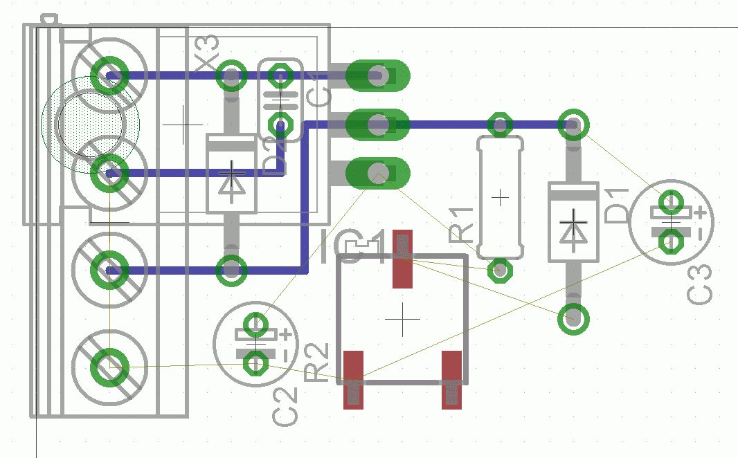 Hallo! Könntet Ihr mir bitte sagen, ob ich die Rücklaufdiode D2 für den LM317 statt wie in Bild 1 an den Regler selbst auch wie in Bild 2 "global" auf die V+-Seite hängen kann? Dann könnte ich D2 auch gleich wie in Bild 3 gezeigt parallel an die 4-pol Printklemme hängen. Oder gibts da elektronisch iwas was dagegen spricht? (Thema Platz sparen...) Zu diesem Thema die zweite Frage: Der TO220 (vom LM317) wird ja für gewöhnlich senkrecht eingebaut, bei Eagle im Board-Layout als liegendes Bauteil dargestellt. Gibt es für den LM317 noch ein EAGLE-Teil mit stehendem TO220, den ich nicht gefunden habe? Oder wie macht Ihr das, um diesen im Boardlayout sowohl platzsparend als auch optisch vernünftig, und nicht wie hier drei andere Bauteile überlappend, darzustellen? (im Bild 3 nur den Teil li.o. betrachten, der Rest der Schaltung ist i.M. nur draufgeklatscht) achja, da fällt mir noch eine Frage 3 ein wenns erlaubt ist: Iwo hatte ich mal gelesen, dass einer der Cs so dicht wie möglich an den Regler ran soll, wegen schwingen oder sowas. Wisst Ihr dazu was?