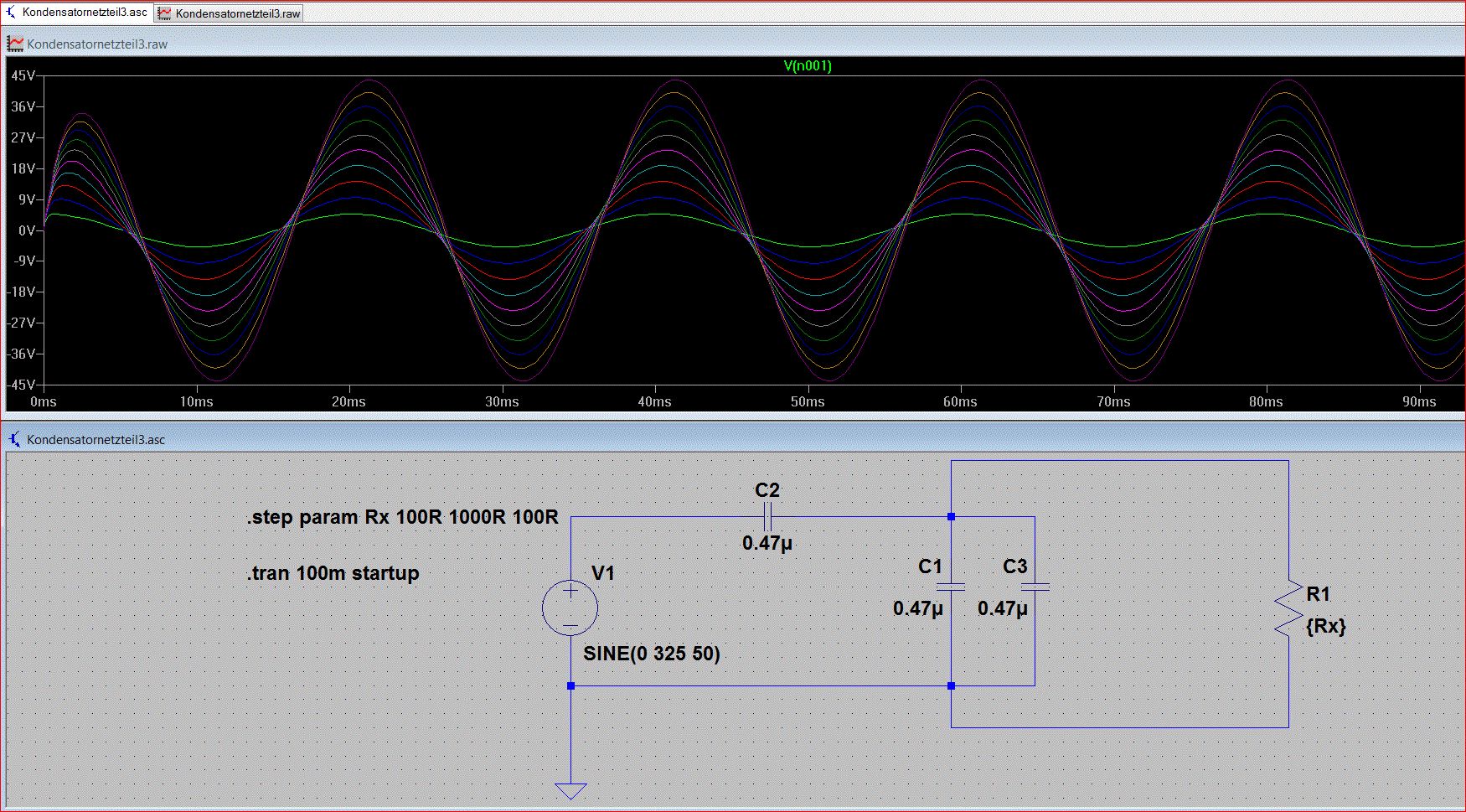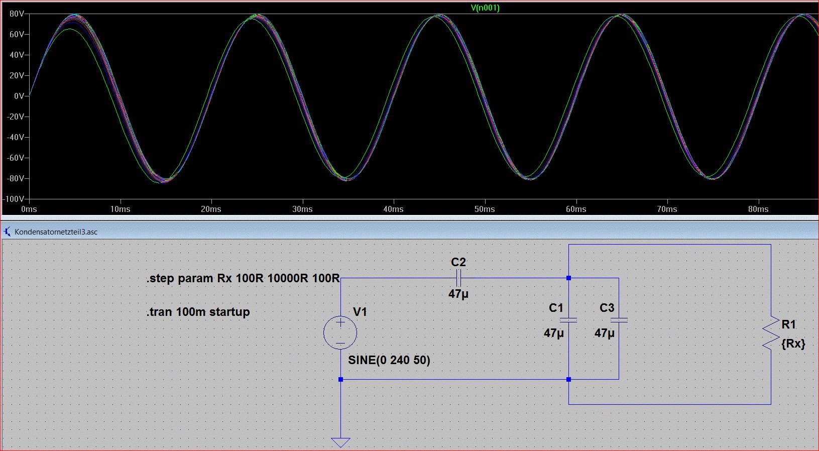 Hallo zusammen, ich habe mir als Ziel gesetzt mit einem kapazitiven Spannungsteiler einen kleinen Motor zu betreiben. Um erst mal die Grundlagen zu prüfen, habe ich in LTSpice ein Modell eines solchen Spannungsteilers erstellt und simulieren lassen. Das Ergebnis ist in beigefügtem Screenshot zu sehen. Bis dahin ist noch alles ok, entspricht das Ergebnis doch dem was in einigen Forenbeiträgen sowie Videos auf YouTube schon beschrieben ist. Jetzt wollte ich das aber mal nachmessen und habe die Schaltung auf dem Steckbrett mal kurz zusammen gebaut sowie mit einem digitalem Voltmeter nachgemessen. Hierbei konnte ich beobachten, wie die gemessene Spannung von anfangs ca. 80V sich langsam (einige Sekunden) einem Grenzwert von 2V annähert. Hierzu stellen sich mir nun 2 Fragen: 1.) Warum gibt die Simulation in Spice das gemessene Verhalten nicht wieder? 2.) Was ist an der Schaltung falsch, bzw. müsste geändert werden, um das Simulationsergebnis aus Spice zu erhalten? Viele Grüße Stefan