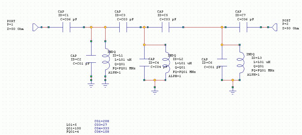 Stelle mir auf einen 50-Ohm-Eingang betrachtet so etwas in der Art vor. Allerdings ohne den enormen Pegelverlust im Durchlassbereich (entsteht er durch die Transformation 50 Ohm --> 3KOhm?).