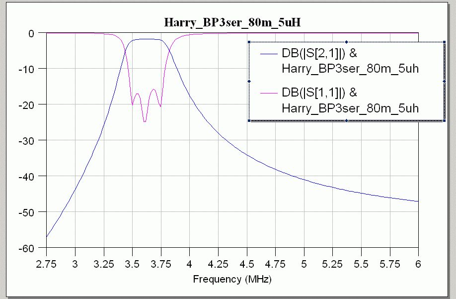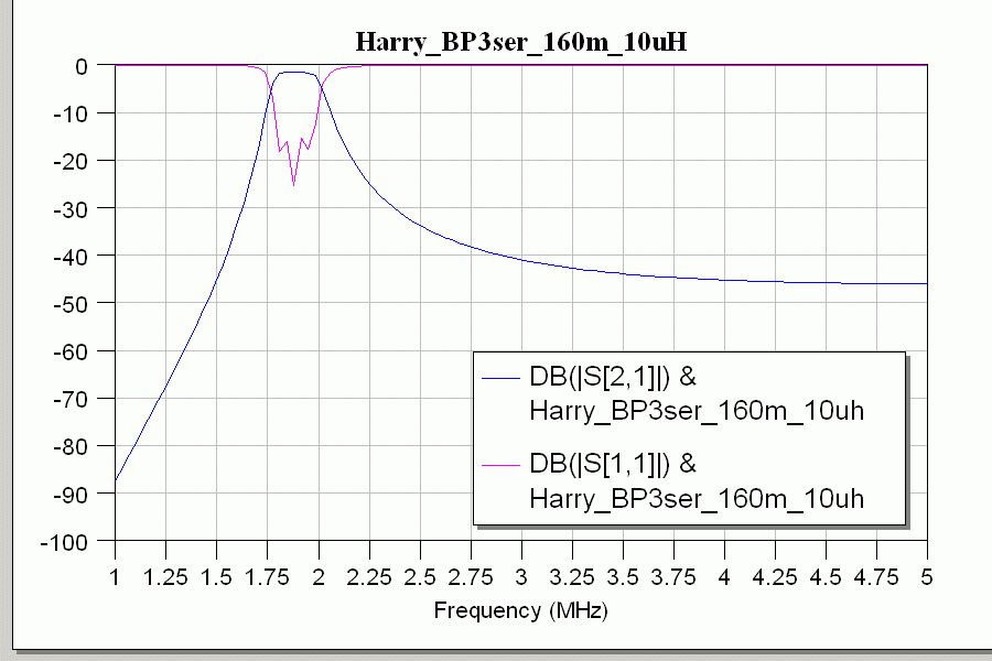 Hallo zusammen, jetzt wird es etwas länger. Zur Antenne: Ein 10MHz Dipol. Die Antennenumschaltung beim Senden <-> Empfangen habe ich mir gespart. Der RX läuft an einem Kelemen Multiband-Dipol und ist über einen Tuner (wahrscheinlich) mehr schlecht als recht angepasst. RX-mässig ist Europa immer drin. Der 10MHz Dipol ist (wäre) natürlich viel besser. Mal sehen, ob ich das noch geregelt bekomme und noch ein Pin am MC frei ist. Das Wichtigste war mir, dass ich für den RX nicht die ganze Zeit den Rechner laufen lassen muss. Zur Zeit sind auf 10MHz die Bedingungen so (schlecht), dass ich an manchen Tagen von ca. 19.00 UTC bis morgens 5.00 UTC keine Rapporte bekomme. ' "What shells" würde der Grieche sagen' @ Daniel: heute war dann die ultimative Geburtstagsfeier mit der Verwandschaft.. und dann ab in die Bude und gerechnet. Die Sache mit dem Hochpass-Tiefpass habe ich nicht weiter verfolgt. Ich bin dann hingegangen und habe 3-polige Bandpassfilter für die Bänder 160m, 80m und 40m berechnet. Die Bildchen anbei. Ich hoffe, es hat geklappt; eins habe ich wohl 2mal hochegladen. (Vielleicht kann das ja ein Moderator löschen?) Alles 3-polig; ist zwar Mehraufwand, dafür aber Schluss, Aus, Ende fertig. Das 160m und das 80m sind mir wohl (?) gelungen, mit dem 40m Filter bin ich auch nicht so ganz zufrieden. Das sind alles nur 'Vorschläge' oder wie auch immer. Zumindest befindet man sich mit den angegebenen Werte immer auf sicherem Terrain und vor allen Dingen in den richtigen Regionen. Das muss alles nicht aufs uH und pF eingehalten werden, aber das Zusammenspiel sollte schon passen. Vor allen Dingen sollten die Ls schon den entsprechenden Wert haben. Auch wenn du meinst, du hättest 2 Ringkerne gleich bewickelt, sie können sich gewaltig unterscheiden. Das ist oft der Unterschied zwischen Gelingen oder nicht. (*) Messmittel hast du ja. Würde mich auch interessieren: Hast du einen Mess!sender? Allen schöne Tage. vy 73 Wilhelm PS: Zu meinem WSPR System werde ich mal ein Foto machen, damit ihr seht, wie das hier so abgeht..(hi) Dazu muss ich erstmal die 'beste aller Ehefrauen' davon überzeugen, dass Sie! das macht. Ich habe weder das Know How noch das Equipment. Zu (*) Bei Box73 Funkamateur gibt es ein LC-Meter zu kaufen, Preis ca. 40 EU. Für den Preis kannst du nichts selber bauen. Danke für das Angebot Jörg, deinen Quelltext zur Verfügung zu stellen.