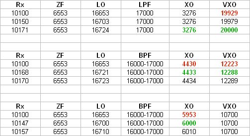 Hallo Daniel Ich hätte evtl. ein Mittel gegen die Pfeifstelle. Du verwendest sowieso einen SA602 als Puffer für den 30m VFO. Schalte einen Quarz mit 3,2768 MHz an den SA602-Oszillator und drehe ihn so hoch als möglich (sind 3,278 möglich ??). Dann stelle den VFO auf einen VXO mit 20 MHz um und versuche den bis 19,929 MHz runterzuziehen. Dann hinter den SA602 ein 17 MHz Tiefpass, um nur das richtige Mischprodukt durzulassen. Die zweite Variante arbeitet mit der Summe aus 12,288 MHz und 4,433 MHz. Beide Frequenzen können nach unten gezogen werden, jedoch wird statt des Tiefpasses ein Bandpass-Filter benötigt. Die dritte Variante arbeitet mit einem 6,0 MHz Resonator und einem 10,7 MHz Quarz. Resonatoren lassen sich wesentlich leichter und weiter ziehen als Quarze. Auch hierfür wird ein Bandbass-Filter benötigt. In der Tabelle Quarze.xls sind viele handelsübliche Quarze aufgelistet und zwar in Form einer Matrix. Einmal wird die Summe aus zwei Frequenzen gebildet, das andere mal die Differenz. Auf diese Weise kann man recht schnell eine Frequenz finden, die sich aus der Summe oder der Differenz zweier Quarze erzeugen läßt. Dies kann nützlich sein für so eine Frequenzsynthese wie hier, es kann sich aber auch um Frequenzen für VXO und Ladderfilter handeln. Gruß, Bernd