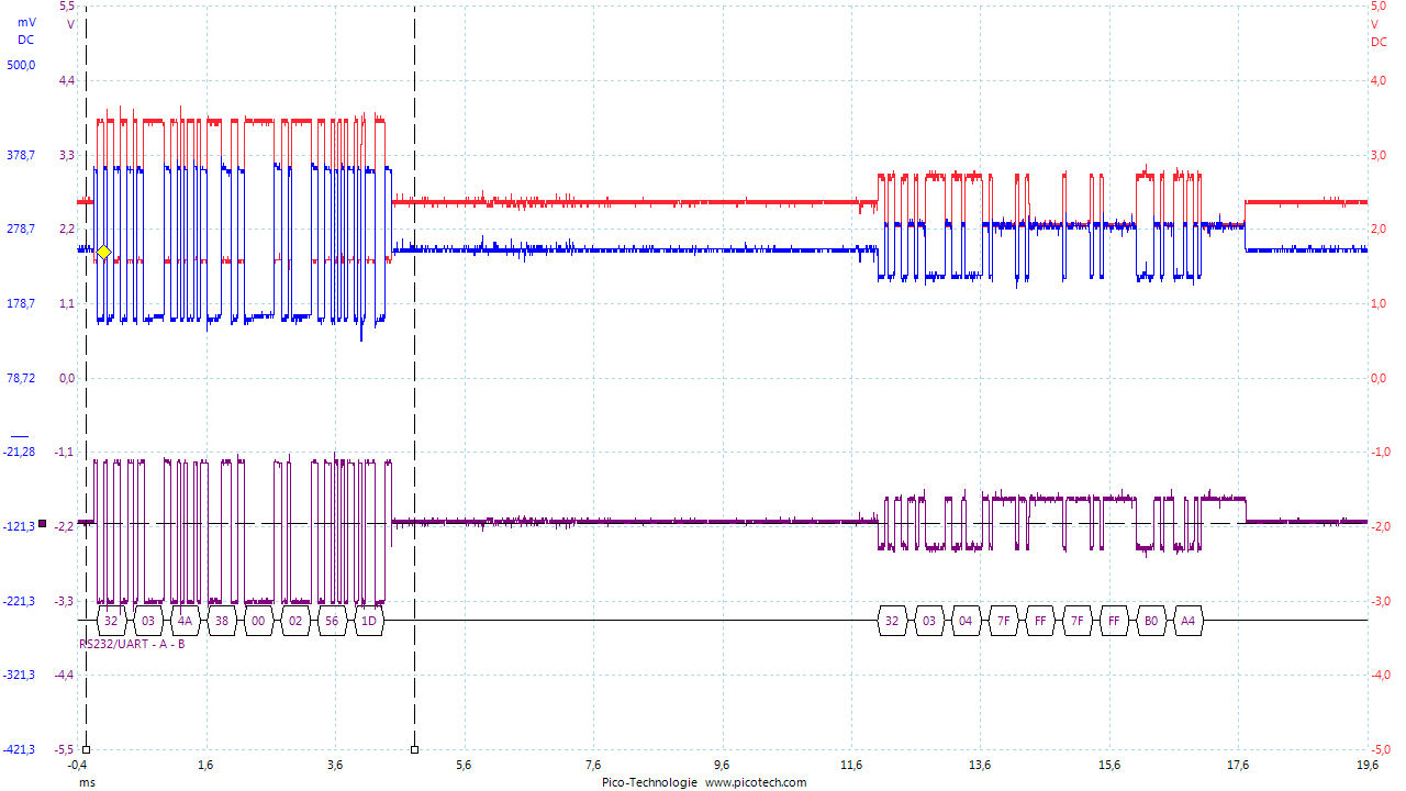 Wie hoch sind denn die Eingangsspannungen an den 485 Modulen? Du hast nur die Ausgangsspannung eines Senders beschrieben. Entscheidend für den Empfang ist aber letztlich die Eingangsspannung alleine. Die Signale mit geringem Pegel sehen irgendwie invertiert aus.