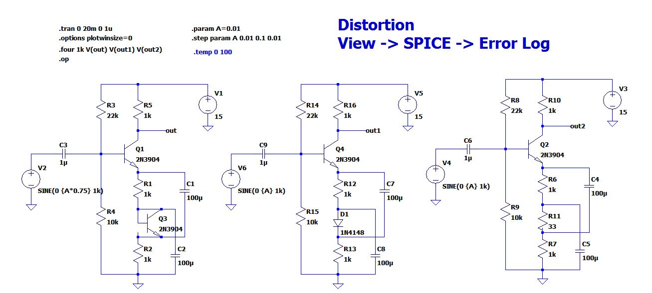 Hallo, ich habe mal die Dateien für die Simulation mit LTspice angehängt. Am besten ist es, wenn man statt der Diode den gleichen Transistor verwendet. Mit "View-> SPICE Error Log" kann man nach der Simulation den Klirrfaktor ablesen. Gruß Helmut Nachtrag: Die Eingangskondensatoren C3, C6, C9 am besten auf 10u erhöhen.