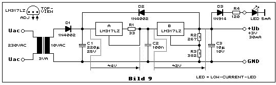 @ollekatz (Gast) > ureg3p09.gif Komische Schaltung, ziemlicher Murks. >Habe mich jetzt für die Samsung 3535 Leds entschieden >http://www.leds.de/High-Power-LEDs/Samsung-High-Po... Wo liegt das Problem? >Es sollen 4 Module, a 5 LEDs werden. Das Netzteil bleibt vorerst(20V / >4,6A) >Kann mal bitte einer drüber schauen, ob ich die Widerstände, für mein >vorhaben richtig eingesetzt habe? >Sollen 4 module werden mit 16,5 Volt und 350 mA Was soll dann der Unsinn mit 2 LM317 hintereinander? Man braucht nur EINEN, nämlich A, der als Kostantstomquelle arbeitet. Für 350mA muss R1=U/I=1,25/0,35A=3,6 Ohm. 3,3 Ohm tuns auch. Mit 20V vom Netzteil ist das alles aber ganz schön knapp, ich würde da lieber noch 1-2V Reserve einplanen. Einen kleinen Kühlkörper für den LM317 nicht vergessen.