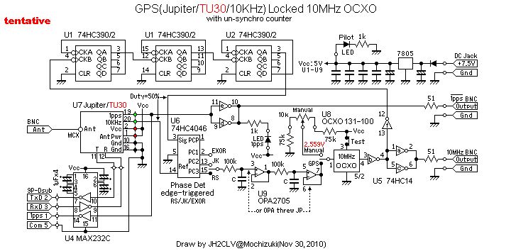 Moin zusammen, ich möchte Euch mal nach Eurer Meinung bzw. Expertise Fragen: ich habe ein OCXO (Doppelofen) mit 10 MHz sowie ein GPS-Empfänger mit 10 KHz. Die 10 KHz sind ohne GPS Signal so ... naja es geht. Aber mit GPS sieht es sehr gut aus. Nun möchte ich mit dem 10 KHz-Signal einen OCXO nachführen. Bauvorschläge gibt es viele. Ich habe hier zwei Konzepte von den Funkamateuren JH2CLV und G3RUH. Wo liegen die Vorteile oder was sind die Nachteile? Unser japanische Freund hat einen 4046 PLL-Baustein verwendet. Ist dieses Konzept daher besser oder geeigneter als das aus England? Im Forum las ich schon "ich würde den 7486 gegen einen 4046 tauschen" aber die Begründung fand ich nicht. Gruß Holger