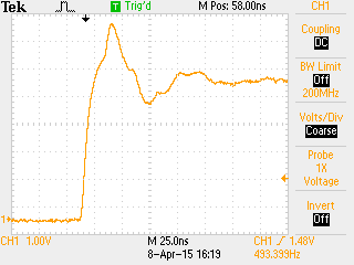 @ Max (Gast) > Arduino-GPIO-Out-Switching-Transient.png Ahhh, der Arduino ist die HF-Quelle! Aber der hat keine 1ns Anstiegszeit, eher 5ns. Ist auch flott, aber um einiges langsamer. >>µC -> 50Ohm Kabel 1.5m -> Oszilloskop auf Hochohmig (>1MOhm) >http://hoeckerson.de/notes/2015/04/triggering-devi... ;-) Naja, man hätte es ja wenigstens mit einer Serienterminierung versuchen sollen. >genau das möchte ich vermeiden. (BNC Kabel kommt zwar keins vor in >meiner Anforderung vom Anfang, aber eine Leitungssführung auf einer PCB >verzerrt das Signal auch) Dazu muss man erstmal richtig messen. Hast du das? Wie? Wo? https://www.mikrocontroller.net/articles/Oszilloskop#Tastk.C3.B6pfe_richtig_benutzen