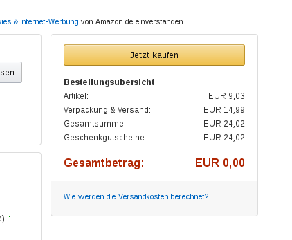 Screenshot ist angehängt. Habe einen 25 Euro Gutschein bekommen und gleich eingelöst (leider). Bei Amazon um 9 Euro bestellt, dazu kommen sage und schreibe 15 Euro Versandkosten. Das war mein erster und letzter Einkauf bei Amazon. Hätte ich das gewußt, hätte ich den Gutschein lieber um 15 Euro an irgendwen verkauft als sie Amazon zu schenken. Wieso ich das hier schreibe? Weil ich will, das diese Information auf google gefunden wird. gn8